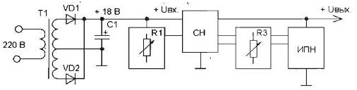 Если имеется возможность, то подсоединение сетевого провода можно осуществить с помощью специальных контактов. Как построена сетевая часть источника питания, понятно из схемы на рис. 5.14. Схема основного узла - стабилизатора напряжения (СН) - приведена на рис. 5.16.