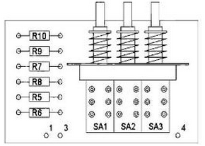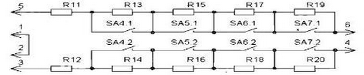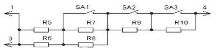 Электрическая схема состоит из переключателей SA1-SA3<П2К) и резисторов R5-R10. Особенность такой схемы состоит в том, что применены все резисторы одинакового номинала (R = 1 Ом). Максимальный ток нагрузки (примерно 600 мА) будет при всех замкнутых переключателях, когда сопротивление R1 составит 0,5 Ом. Соответственно, ток будет равен 300 мА (при разомкнутом SA1), 150 мА (при разомкнутых SA1 и SA2), 100 мА (при разомкнутых SA1, SA2 и SA3). Переключатели. П2К должны иметь независимую фиксацию и тогда можно нажимать не только одну кнопку. Возможны и другие сочетания нажатых кнопок, что будет соответствовать иным токам ограничения. Читателю самому предлагается определить эти дополнительные значения тока ограничения. Следует отметить одну особенность. На схеме имеется перемычка 1-3. Она предназначена для исключения опасного режима при ремонтных работах и при неустановленной плате регулировки тока и случайной подаче питающего напряжения. Так как перемычка включается последовательно во входную цепь стабилизатора, то при ее отсутствии плата импульсного понижающего стабилизатора будет обесточена. Регулировка выходного напряжения импульсного понижающего стабилизатора осуществляется, резистором в верхнем плече делителя обратной связи (R3.1). Он выполнен также на переключателях П2К и резисторах. Номиналы этих резисторов рассчитаны таким образом, чтобы выходное напряжение могло изменяться с шагом 1 В. Обойтись меньшим количеством деталей можно, выбрав соотношение номиналов резисторов (R13: R14 : R15 : R16) по двоичному закону: 1-2-А-8. Таким образом, с помощью секционированного резистора, схема которого показана на рис. 5.18, можно устанавливать величину верхнего плеча делителя как в СН, так и в ИПН. В этом случае выходное напряжение может иметь величину от 3 до 18 В, т.к. сопротивление изменяется от 1,8 кОм до 16,8 кОм (1,8 кОм + 15 кОм).