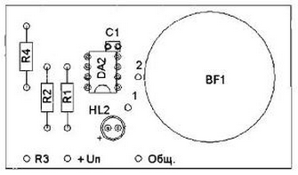 Еще одна особенность конструкции платы заключается в том, что накопительный дроссель фильтра выполнен на цилиндрических малогабаритных унифицированных дросселях типа ДМ (ДПМ). Для получения требуемой индуктивности предусмотрено последовательное включение до 3 дросселей типа ДМ. Индикатор наличия выходного напряжения на светодиоде HL1 может быть установлен на лицевой панели корпуса источника питания и соединен с платой импульсного стабилизатора проводами. Предельный ток нагрузки устанавливается с помощью секционированного резистора, расположенного вместе с переключателями на плате, показанной на рис. 5.21. Выходное напряжение СН и напряжение срабатывания ИПН устанавливается с помощью секционированного переключаемого резистора, детали которого располагаются на плате, показанной на рис. 5.22. Переключатели. П2К устанавливаются горизонтально в отверстия на плате и их закрепление производится не винтами, а с помощью пайки. А резисторы верхнего плеча делителя монтируются навесным способом на выводах П2К. При этом резисторы каждого делителя располагаются с разных сторон и подсоединяются к плате проводами. И, наконец, на общей плате находится еще индикатор понижения напряжения на выходе СН, расположение элементов которого показано на рис. 5.23. Пьезоизлучатель BF1 припаивается непосредственно на плату. Светодиод HL2, индицирующий опасный режим работы источника питания, можно установить на лицевой стороне корпуса и подсоединить к плате проводами.