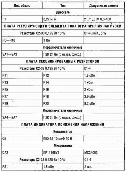Убедившись, что эта часть устройства функционирует правильно, надо произвести еще проверку под нагрузкой. Для этого к выходу выпрямителя подсоединяют резистор величиной 27 Ом (2 Вт) для обеспечения тока нагрузки в 0,4...0,6 А и еще раз проверяют напряжение на выходе. Его величина должна быть примерно 12 В. Убедившись в нормальной работе платы с выпрямителем, ее можно использовать для проверки функционирования платы СН. Однако, прежде чем подать напряжение на СН, необходимо поставить перемычку между контактами платы, соединяющими выводы микросхемы 6 и 7, т. е. исключить резистор ограничения тока нагрузки (R1). Еще необходимо установить временный делитель выходного напряжения (для обратной связи). Резистор величиной 6,8 кОм должен быть на месте резистора R3.1 между выводом 5 микросхемы и выходом СН <Uвых). После всех этих подготовительных операций можно подать входное напряжение и проверить работу СН при RH = 200 Ом, т. е. при небольшом токе нагрузки (lн - 40 мА). Мощность этого резистора должна быть не менее 0,5 Вт. В таком режиме измеряем выходное напряжение СН, его величина должна быть примерно в В. Следующий шаг - это проверка стабильности выходного напряжения при изменении нагрузки. Для этого подключаем параллельно резистору нагрузки еще такой же (200 Ом), т. е. получаем RH = 100 Ом. При этом ток нагрузки возрастет вдвое и будет примерно 80 мА. Измерив снова выходное напряжение, необходимо убедиться, что оно меняется в соответствии с параметрами микросхемы и весь узел работает нормально. Теперь надо проверить плату секционированных резисторов. Это можно сделать с помощью мультиметра (цифрового тестера). Убедившись, что при нажатии определенной кнопки общая величина резистора, измеренная прибором, соответствует заложенной при проектировании, эту плату можно установить на общую. Далее аналогично проверяют плату с резисторами регулирующего элемента тока ограничения нагрузки (R5-R10) и также устанавливают ее на общую плату. Когда на общей плате окажутся установленными все три платы: стабилизатора напряжения, секционированных делителей и регулирующего элемента тока ограничения нагрузки, то можно приступать к комплексной проверке функционирования полностью собранного ИСН без сетевой части. Это можно сделать с помощью дополнительного регулируемого источника питания. Для упрощения проверки в этом качестве можно использовать сетевую часть нашего источника питания, но при этом необходимо учесть, что некоторые параметры (например, стабильность по напряжению) не смогут быть проверены. Последовательность проверки собранного источника питания следующая: