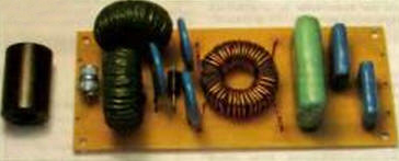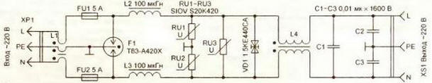 Печатная плата изготовлена из односторонне фольгированного стеклотекстолита толщиной 1,5 мм. Заземляющий защитные элементы печатный проводник на плате для увеличения площади сечения облущивают припоем, создавая валик высотой 1...1,5 мм. Сетевой кабель используют с проводами сечением не менее 1 мм2. На него надевают ферритовый цилиндр. К18*9х30 мм (показан слева на рис. 4). Такие цилиндры зарубежные производители устанавливают на кабелях для подключения различных устройств к компьютеру. Дроссели L2 и L3 наматывают проводом ПЭВ-2 диаметром 1 мм каждый на двух сложенных вместе кольцевых магнитопроводах. КП27>15-6мм из пермаллоя МП 140. Намотку выполняют в два полных слоя без межслойной изоляции, автор использовал готовые дроссели, покрытые эмалью в целях влагозащиты. Можно также применить магнитопровод. К28>14-12мм от многообмоточного дросселя в импульсном блоке питания AT компьютера. Дроссель L4 выполняют на кольце К28-15-10мм из феррита М2000НМ. Острые кромки магнитопровода закругляют надфилем, а затем изолируют лакотканью или фторопластовой лентой. Каждая из обмоток содержит 15 витков провода. ПЭВ-2 диаметром 1 мм, из конструктивных соображений для удобства подключения выводов к печатной плате одну из обмоток наматывают в направлении, противоположном использованному для другой обмотки. В этом случае создаваемые втекающим и вытекающим токами поля в магнитопроводе будут взаимно скомпенсированы и магнитное насыщение тем самым исключено. Правильность исполнения дросселя можно проверить, измерив его индуктивность. В данной конструкции индуктивность каждой обмотки составляет 270 мкГн. Если соединить выходные концы обмоток и измерить входную индуктивность, она не превысит 10 мкГн. Варисторы RU1-RU3 - SIOV S20K420. их можно заменить другими металлооксидными диаметром 20 мм и классификационным напряжением 420 В. В крайнем случае можно использовать оксидно-цинковые того же диаметра с классификационным напряжением 430 В, маркируемые, например, одним из производителей как MYG20K431. Высоковольтные конденсаторы С1 - С3 - из серии К78-2. Симметричный защитный диод 1,5КЕ440СА можно заменить двумя такими же однополярными (без индекса СА) или их аналогами. В этом случае защитное устройство целесообразно дополнить индикатором сетевого напряжения и исправности защитных диодов. Во время эксплуатации устройства необходимо периодически, особенно после грозовых дней, выполнять контроль технического состояния устройства и своевременно заменять элементы выработавшие свой ресурс. Автор: Косенко С.
