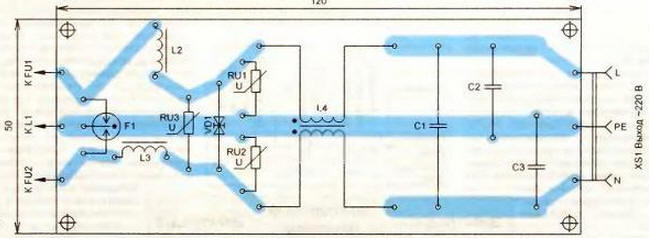 Устройство подключают к сети с помощью электрической вилки. ХР1 с заземляющим контактом. Плавкие вставки FU1, FU2 рассчитаны на нагрузку до 1 кВт, подключаемую к розетке XS1, их наличие значительно повышает надежность защитного устройства и продлевает ресурс используемых в нем других элементов. Кратковременные помехи, неспособные вызвать срабатывание разрядника F1, будут ослаблены дросселями L2-L4 и поглощены защитным диодом VD1. Значительный вклад в ослабление таких помех вносит также надетый на сетевой кабель ферритовый цилиндр, в результате чего образуется дроссель L1. Окончательно подавляет симметричные кратковременные сетевые помехи конденсатор С1, несимметричные - С2 и С3. Подавление фронта продолжительных сетевых помех, порождаемых грозовыми разрядами, происходит в первую очередь защитным диодом VD1 и варисторами RU1-RU3. Через 250 нс включившийся разрядник F1 отводит помеху на себя, а сработавшие плавкие вставки FU1, FU2 отключают источник питания аппаратуры от сети до наступления критических последствий. Рассеиваемая защитными элементами в сетевом фильтре энергия импульсных помех выделяется в виде тепла при этом температура элементов может достигать 200°С и более. Поэтому из соображении пожарной безопасности корпус устройства необходимо изготавливать только из металла. Соединение корпуса с проводом от заземляющего контакта вилки. ХР1 выполняют в непосредственной близости от ввода сетевого кабеля в корпус фильтра. Розетку XS1 соединяют короткими проводами с соответствующими контактными площадками, указанными на чертеже печатной платы устройства (рис. 3).