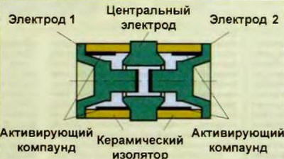 Рассмотрим трехэлектродный разрядник Т23-А230Х диаметром 8 и длиной 10 мм. Несмотря на столь малые размеры, этот защитный элемент допускает пиковый разрядный ток в многократных одиночных импульсах 8/20 мкс (фронт/спад) до 20 кА или в течение 1 с выдерживает переменный разрядный ток 10, а частотой 50 Гц. Такая эффективность защиты обеспечена особой конструкцией разрядника, которую иллюстрирует рис 1. В исходном состоянии его сопротивление превышает 10 Ом. Когда напряжение в разрядном промежутке создает напряженность электрического поля, способную вызвать ионизацию газа, происходит электрический разряд, в результате чего сопротивление разрядника резко снижается. По завершении импульса инертный газ восстанавливает свои изоляционные свойства. Напряжение пробоя разрядного промежутка определяется как размерами и конструкцией электродов, так и свойствами заполняющего газа - составом и давлением. Специальное компаундное покрытие электродов и керамического изолятора между ними активирует их эмиссионную способность. Кольцевая форма центрального электрода позволяет максимально использовать поверхность торцевых электродов 1 и 2, обеспечивая большой разрядный ток без эрозии токонесущих поверхностей. Чтобы компенсировать запаздывание в срабатывании от помехи с крутым фронтом (1 кВ/мкс и более), разрядники в многоступенчатых защитных устройствах, как правило, дополняют варисторами и защитными диодами, которые отводят на себя часть энергии импульсной помехи в начальный момент ее появления в электрической сети. Металлооксидный варистор аналогичен симметричному стабилитрону - при превышении некоторого порогового значения прикладываемого напряжения сопротивление элемента резко падает. Классификационное напряжение варистора должно превышать максимальную амплитуду напряжения сети не менее чем на 5 %. Например, максимально допустимому повышению сетевого напряжения 220 В на 20 % (264 В) соответствует амплитуда 374 В. Следовательно, классификационное напряжение варистора должно быть не менее 393 В. Если использовать варистор, как во многих промышленно изготавливаемых защитных устройствах, со стандартным классификационным напряжением 390 В, в силу допускаемой технологической погрешности данного параметра существует риск его повреждения. Поэтому лучше его использовать с несколько большим классификационным напряжением варистор характеризуется также некоторой предельной энергией импульса, которую он может поглотить без разрушения. Такая характеристика обладает свойством накопления. Это значит, что прибор без ухудшения параметров способен поглотить одиночный импульс с некоторой максимально допустимой энергией или некоторое число импульсов с меньшей энергией. Например, металлооксидный варистор диаметром 20 мм поглощает импульс с максимально допустимой энергией 410 Дж либо 10 импульсов с энергией 40 Дж. После выработки варистором заложенного ресурса его классификационное напряжение несколько увеличится, а затем с каждым последующим импульсом начнет резко снижаться, в результате варистор "выгорит". Поэтому он подлежит замене при малейшем внешнем проявлении деградации (потемнении лакокрасочного покрытия). Необходимость контроля технического состояния вариатора, находящегося внутри закрытого сетевого фильтра, является его недоста