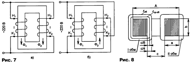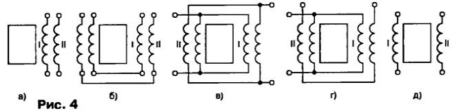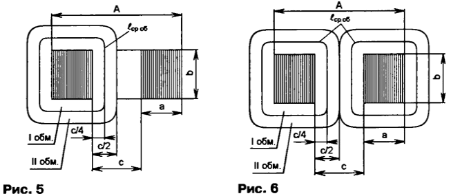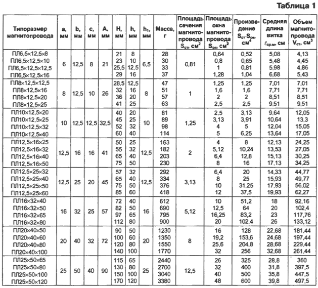 В тороидальных трансформаторах практически весь магнитный поток проходит по магнитопроводу, поэтому индуктивность рассеяния у них минимальная, однако сложность изготовления обмоток весьма высока. На основании вышесказанного выбираем стержневой ленточный магнитопровод [3]. Подобные магнитопроводы изготавливают следующих типов: ПЛ-стержневой ленточный; ПЛВ - стержневой ленточный наименьшей массы; ПЛМ - стержневой ленточный с уменьшенным расходом меди; ПЛР - стержневой ленточный наименьшей стоимости. На рис. 3 показаны обозначения габаритных размеров магнитопровода: А - ширина; Н - высота; а - толщина стержня; b - ширина ленты; с - ширина окна; h - высота окна; h1 - высота ярма. Стержневым магнитопроводам присвоено сокращенное обозначение, например, ПЛ8х 12,5x16, где ПЛ - П-образный ленточный, 8 - толщина стержня, 12,5 - ширина ленты, 16 - высота окна. Размеры магнитопроводов ПЛ и ПЛР приведены в табл. 1 и 2. Варианты размещения катушек на магнитопроводе Различные варианты расположения катушек на стержнях магнитопровода сравним по одному из основных параметров трансформаторов - индуктивности рассеяния, которую рассчитаем по формуле из [2] где μ0 = 4π·10-7 Гн/м - магнитная постоянная; w, - число витков первичной обмотки; вср.об - средняя длина витка обмоток, см; b - толщина обмоток, см; h - высота обмотки, см. Эта формула получена при условии, что обмотки - цилиндрические, не секционированы и расположены концентрически. Схемы соединения обмоток для всех вариантов показаны на рис. 4. Сравнительные расчеты проведем для трансформатора на магнитопроводе ПЛx10x12,5x40, имеющего одну первичную и одну вторичную обмотки. Чтобы все расчетные варианты находились в одинаковых условиях, примем толщину обмоток b = с/4 и число витков первичной обмотки w1 = 1000. Рассмотрим первый вариант, когда первичная и вторичная обмотки расположены на одном стержне (рис. 4, а). Чертеж катушки показан на рис. 5. Сначала рассчитаем среднюю длину витка обмоток а затем индуктивность рассеяния катушки первого варианта Во втором варианте первичная и вторичная обмотки разделены на две равные части, которые размещены на двух стержнях (рис. 4, б). Каждая катушка состоит из половины обмотки W1 и половины w2. Чертеж катушек показан на рис. 6. Вычислим индуктивность рассеяния одной катушки (W1 = 500), а затем результат удвоим, поскольку катушки одинаковы: Две первичные обмотки в третьем варианте расположены в двух катушках на разных стержнях, каждая из которых содержит по 1000 витков. Обе первичные обмотки соединены параллельно. Вторичная обмотка также размещена в двух катушках на разных стержнях, причем возможны два случая: две полуобмотки с полным числом витков, соединенные параллельно (рис. 4, в), или вторичная обмотка разделена на две полуобмотки с вдвое меньшим числом витков, соединенные последовательно (рис. 4, г). Чертеж катушек показан на рис. 6. В этом варианте индуктивность рассеяния такая же, как и во втором варианте: LS3 = LS2 = 2,13 мГн. Следует помнить, что во втором и третьем вариантах первичные и вторичные обмотки и полуобмотки должны быть включены согласно, чтобы создаваемые ими магнитные потоки в магнитопроводе имели одинаковое направление. Другими словами, магнитные потоки должны суммироваться, а не вычитаться. На рис. 7, а показано неправильное подключение, а на рис. 7, б - правильное. Необходимость соблюдения п