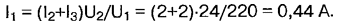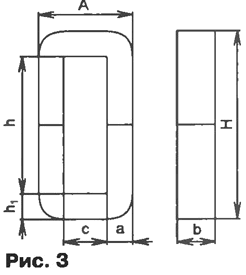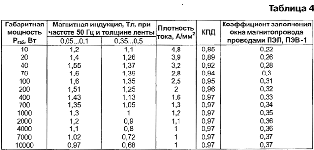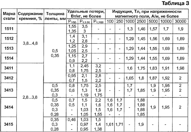 Следовательно, при изготовлении трансформаторов малой мощности следует выбирать схему соединения и расположение обмоток, рассмотренные во втором варианте. Вторичные полуобмотки можно соединять и последовательно, если необходимо получить более высокое напряжение на выходе, и параллельно, если требуется больший выходной ток. Краткие сведения о материалах магнитопроводов До сих пор мы не учитывали потери в реальном трансформаторе, которые складываются из потерь в магнитопроводе - на вихревой ток и перемагничивание (гистерезис): в расчетах их учитывают как мощность потерь в стали Рст, и потери в обмотках - как мощность потерь в меди Рм. Итак, суммарная мощность потерь в трансформаторе равна: P∑ = Рст + Рм = Рв.т + Рг + Рм, где Рв.т - мощность потерь на вихревой ток; Рг - мощность потерь на гистерезис. Для их уменьшения сталь подвергают термообработке - удаляют углерод, а также легируют - добавляют кремний, алюминий, медь и другие элементы. Все это повышает магнитную проницаемость, уменьшает коэрцитивную силу и, соответственно, потери на гистерезис. Кроме того, сталь подвергают холодной или горячей прокатке для получения необходимой структуры (текстуры проката). В зависимости от содержания легирующих элементов, структурного состояния, магнитных свойств стали маркируют четырехзначными числами, например, 3412. Первая цифра означает класс электротехнической стали по структурному состоянию и классу прокатки: 1 - горячекатаная изотропная; 2 - холоднокатаная изотропная; 3 - холоднокатаная анизотропная с ребровой текстурой. Вторая цифра - процент содержания кремния: 0 - нелегированная сталь с суммарной массой легирующих элементов не более 0,5 %; 1 - легированная с суммарной массой свыше 0,5, но не более 0,8 %; 2 - 0,8...1,8 %; 3 - 1,8...2,8 %; 4 - 2,8...3,8 %; 5 - 3,8...4,8 %. Третья цифра - группа по основной нормируемой характеристике (удельные потери и магнитная индукция): 0 - удельные потери при магнитной индукции 1,7 Тл на частоте 50 Гц (Pij/so); 1 - потери при магнитной индукции 1,5 Тл на частоте 50 Гц (P1,5/50); 2 - при индукции 1 Тл на частоте 400 Гц (Р1/400); 6 - индукция в слабых магнитных полях при напряженности 0,4 А/м (В0,4); 7 - индукция в средних магнитных полях при напряженности 10 А/м (В10) или 5 А/м (В5). Первые три цифры обозначают тип электротехнической стали. Четвертая цифра - порядковый номер типа стали. Магнитопроводы трансформаторов для бытовой техники изготавливают из холоднокатаной текстурованной стали марок 3411-3415 [3] с нормированными удельными потерями при магнитной индукции 1,5 Тл на частоте 50 Гц и удельным сопротивлением 60·10-8 Ом·м. Параметры некоторых марок электротехнической стали приведены в табл. 3. Холоднокатаная электротехническая сталь обладает более высокими магнитными характеристиками. Кроме того, более гладкая поверхность позволяет увеличить коэффициент заполнения объема магнитопровода (ксТ) до 98 % [4]. Исходные данные для расчета трансформатора Рассчитаем трансформатор, имеющий первичную и две одинаковые вторичные обмотки, со следующими параметрами: эффективное (действующее) напряжение первичной обмотки U1 = 220 В; эффективное (действующее) напряжение вторичных обмоток U2 = U3 = 24 В; эффективный (действующий) ток вторичных обмоток l2 = I3 = 2А. Частота сетевого напряжения f = 50 Гц. Коэффициент трансформации равен отношению напряжения на первичной к напряжению на разомкнутой (ЭДС) вторичн
