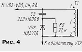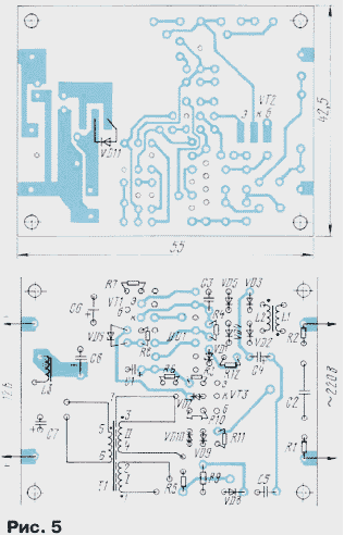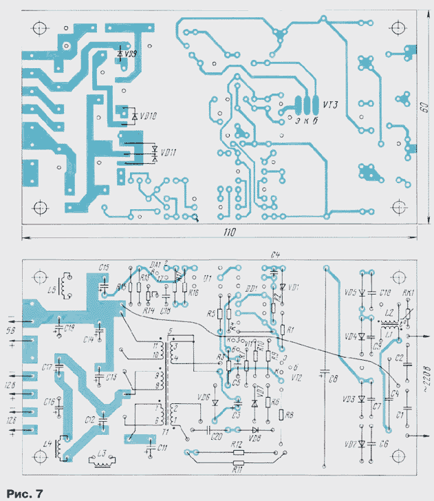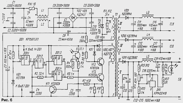 ЭНЦИКЛОПЕДИЯ РАДИОЭЛЕКТРОНИКИ И ЭЛЕКТРОТЕХНИКИ Сетевые импульсные блоки питания Энциклопедия радиоэлектроники и электротехники / Блоки питания Импульсные источники питания пока еще не получили широкого распространения в радиолюбительской практике. Объясняется это в основном их высокой сложностью и соответственно стоимостью. Однако в ряде случаев преимущества этих устройств в сравнении с традиционными трансформаторными блоками - большой КПД, малые габариты и масса - могут иметь решающее значение. В предлагаемой статье описаны несколько импульсных источников для различных нагрузок. Спор при выборе источника питания (ИП) для конкретного прибора чаще всего заканчивается в пользу традиционных трансформаторных блоков с непрерывным способом стабилизации выходного напряжения как наиболее простых в разработке и изготовлении. А то, что у них увеличены габариты и масса, небольшой КПД, значительный нагрев, практически во внимание обычно не принимают. Наиболее важный аргумент - стоимость. Кроме того, бытует мнение, что импульсные ИП, особенно сетевые, ненадежны, создают высокочастотные помехи, более сложны в изготовлении и регулировке, да и дороги. Эти рассуждения чаще всего традиционны в тех случаях, когда сначала проектируют прибор, а потом подбирают для него ИП из числа имеющихся в продаже. При этом нередко оказывается, что выбранный ИП не совсем подходит для прибора: то он тяжеловат, то сильно греется, да и аппаратура работает неустойчиво. Ничего подобного не происходит, если ИП проектируют под конкретный прибор, класс аппаратуры с учетом особенностей входного напряжения и нагрузки. В этом случае некоторые усложнения ИП, например, переход к импульсному способу стабилизации выходного напряжения, придают прибору в целом новые качества, существенно улучшают его характеристики, что увеличивает потребительскую цену всего прибора и окупает затраты на усложнение ИП. Ниже рассмотрены несколько вариантов сетевых импульсных ИП, спроектированных для конкретных приборов с учетом особенностей отечественной однофазной сети напряжением 220 В и частотой 50 Гц. Результаты эксплуатации в течение 5...7 лет позволяют рекомендовать их для повторения радиолюбителям, которые знакомы с основными понятиями силовой электроники, принципами импульсного регулирования и особенностями элементной базы. Принципы работы, технология изготовления и элементная база ИП специально выбраны близкими, поэтому наиболее подробно будет рассмотрен базовый ИП, а у остальных указаны только их отличительные особенности. На рис. 1 приведена схема одноканального импульсного ИП, разработанного для телефонных аппаратов с автоматическим определителемномера (АОН). Он может быть пригоден и для питания других цифровых и аналоговых приборов постоянным напряжением 5...24 В и мощностью 3...5 Вт соответственно, ток потребления которых в процессе работы изменяется незначительно. ИП защищен от замыкания на выходе с автоматическим возвратом в рабочий режим после устранения перегрузки. Нестабильность выходного напряжения при изменении входного - от 150 до 240 В, тока нагрузки - в пределах 20...100 % от номинального и температуре окружающей среды 5...40°С не превышает 5 % относительно номинального значения. Входное напряжение поступает на выпрямитель VD2-VD5 через противопомеховый филь