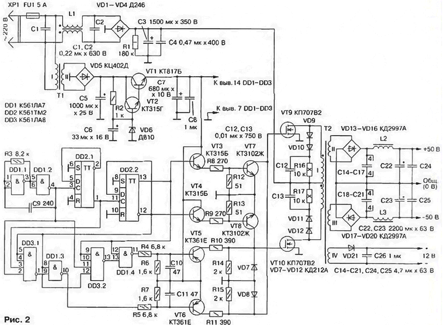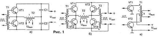 ЭНЦИКЛОПЕДИЯ РАДИОЭЛЕКТРОНИКИ И ЭЛЕКТРОТЕХНИКИ Импульсный блок питания мощного УМЗЧ Энциклопедия радиоэлектроники и электротехники / Блоки питания Импульсные источники питания широко используются в современной радиоэлектронной аппаратуре. Чаще стали применять их и радиолюбители, о чем свидетельствует возросшее число публикаций в радиотехнической литературе, в частности в журнале "Радио". Однако в большинстве случаев описываются относительно маломощные конструкции. Автор публикуемой статьи предлагает вниманию читателей импульсный блок питания мощностью 800 Вт. От описанных ранее он отличается применением в преобразователе полевых транзисторов и трансформатора с первичной обмоткой со средним выводом. Первое обеспечивает более высокий КПД и пониженный уровень высокочастотных помех, а второе - вдвое меньший ток через ключевые транзисторы и исключает необходимость в развязывающем трансформаторе в цепях их затворов. Недостаток такого схемного решения - высокое напряжение на половинах первичной обмотки, что требует применения транзисторов с соответствующим допустимым напряжением. Правда, в отличие от мостового преобразователя, в данном случае достаточно двух транзисторов вместо четырех, что упрощает конструкцию и повышает КПД устройства. В импульсных блоках питания (ИБП) используют одно- и двухтактные высокочастотные преобразователи. КПД первых ниже, чем вторых, поэтому однотактные ИБП мощностью более 40...60 Вт конструировать нецелесообразно. Двухтактные преобразователи позволяют получать значительно большую выходную мощность при высоком КПД. Они делятся на несколько групп, характеризующихся способом возбуждения выходных ключевых транзисторов и схемой включения их в цепь первичной обмотки трансформатора преобразователя. Если говорить о способе возбуждения, то можно выделить две группы: с самовозбуждением и внешним возбуждением. Первые пользуются меньшей популярностью из-за трудностей в налаживании. При конструировании мощных (более 200 Вт) ИБП сложность их изготовления неоправданно возрастает, поэтому для таких источников питания они малопригодны. Преобразователи с внешним возбуждением хорошо подходят для создания ИБП повышенной мощности и порой почти не требуют налаживания. Что касается подключения ключевых транзисторов к трансформатору, то здесь различают три схемы: так называемую полумостовую (рис. 1, а), мостовую (рис. 1, б) и с первичной обмоткой, имеющей отвод от середины (рис. 1, в). На сегодняшний день наибольшее распространение получил полумостовой преобразователь [1]. Для него необходимы два транзистора с относительно невысоким значением напряжения Uкэ max. Как видно из рис. 1, а. конденсаторы С1 и С2 образуют делитель напряжения, к которому подключена первичная (I) обмотка трансформатора Т2. При открывании ключевого транзистора амплитуда импульса напряжения на обмотке достигает значения Uпит/2 - Uкэ max. Мостовой преобразователь [2] аналогичен полумостовому, но в нем конденсаторы заменены транзисторами VT3 и VT4 (рис. 1. б), которые открываются парами по диагонали. Этот преобразователь имеет несколько более высокий КПД за счет увеличения напряжения, подаваемого на первичную обмотку трансформатора, а следовательно, уменьшения тока, протекающего через транзисторы VT1 - VT4. Амплитуда напряжения на первичной о