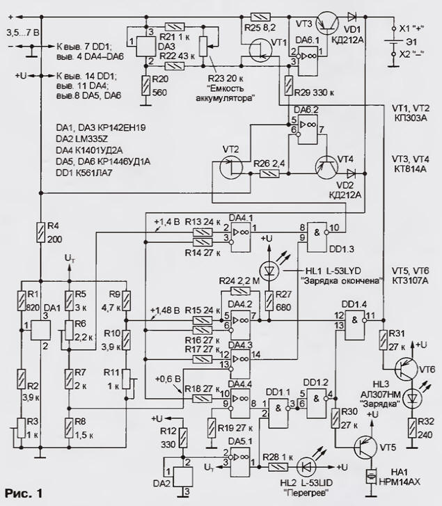 ЭНЦИКЛОПЕДИЯ РАДИОЭЛЕКТРОНИКИ И ЭЛЕКТРОТЕХНИКИ Безопасное зарядное устройство Энциклопедия радиоэлектроники и электротехники / Зарядные устройства, аккумуляторы, гальванические элементы В предлагаемой конструкции акцент сделан на безопасность зарядки. Устройство проверяет правильность подключения аккумулятора, автоматически отключает его по окончании зарядки, прекращает зарядку при нагревании аккумулятора выше заданной температуры. Известно, что даже алгоритм быстрой зарядки (током 1...2С, где С - емкость аккумулятора) предполагает длительность процесса зарядки 1...5 ч [1]. Трудно представить, что все это время за процессом будет вестись наблюдение. И это притом, что именно быстрая зарядка является наиболее опасной. Даже при небольшом несоблюдении режима возможен разрыв корпуса аккумулятора со всеми вытекающими последствиями. Существенно более безопасна стандартная зарядка током 0,1С, но она длится чересчур долго (до 14...16ч). Описываемое устройство обеспечивает ускоренную зарядку (4...7 ч) одного Ni-Cd или Ni-MH аккумулятора емкостью от 250 до 1000 мАч. Широкий интервал тока зарядки отнюдь не способствует безопасности работы устройства из-за возможных ошибок пользователя при установке тока зарядки, поэтому предусмотрены различные способы защиты аккумулятора и самого зарядного блока. В результате получилось устройство, которое может показаться излишне сложным. Однако эта сложность окупится продленным сроком службы аккумулятора и спокойствием за противопожарную обстановку в квартире. Возможность зарядки лишь одного аккумулятора обусловлена желанием обеспечить полную и, опять же, безопасную зарядку. Из технических характеристик устройства следует отметить "мягкий" режим ускоренной зарядки, автоматическое отключение аккумулятора после окончания зарядки, защиту от неверной полярности его подключения и от перегрева, индикацию режимов, звуковое оповещение об аварийном режиме и, наконец, довольно низкое напряжение питания (от 3,5 В), что в некоторых случаях может оказаться весьма желательным. Принципиальная схема устройства изображена на рис. 1. Его основная часть - стабилизатор тока - состоит из трех узлов: задающего стабилизатора напряжения и двух идентичных по схеме регуляторов тока. Основной регулятор (DA6.1, VT3) обеспечивает ток зарядки, равный 0,1С, и работает на протяжении всего цикла. Второй регулятор (DA6.2, VT4) - его можно назвать форсированным - выдает ток, равный 0,ЗС, и включается, когда напряжение на аккумуляторе больше 0,6 В, но не достигло 1,4 В. В это время работают оба регулятора и, будучи включенными параллельно, питают аккумулятор суммарным током 0,4С. Ограничения на работу форсированного регулятора тока обусловлены следующим. Если аккумулятор сильно разряжен (напряжение на нем Uакк< 0,6 В), заряжать его большим током небезопасно, поэтому зарядка производится током 0,1С с участием только основного регулятора тока. Когда же напряжение Uакк достигает 1,4 В, форсированный регулятор отключается, так как это напряжение близко к предельному, и дальнейшую зарядку целесообразно производить стандартным током 0,1С. По достижении Uакк= 1,48 В отключается и основной регулятор - зарядка прекращается. При этом светодиод HL3 ("Зарядка") гаснет, a HL1 ("Зарядка окончена") загорается. Диоды VD1, VD2 предотвращают разрядку аккумулятора после прекращения за