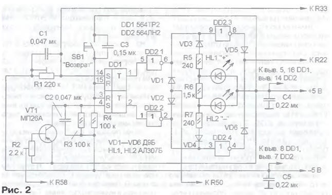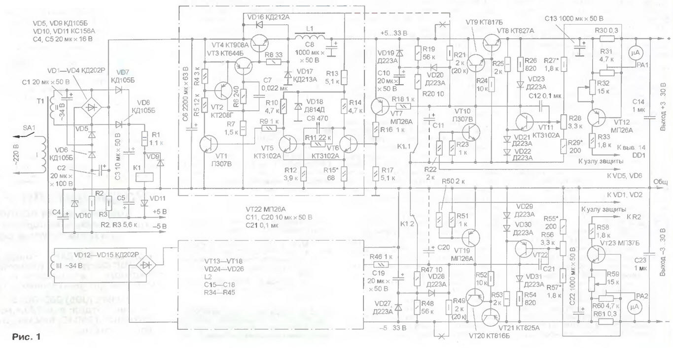 Схема источника питания показана на рис. 1. Штрихпунктирной линией выделены одинаковые узлы в обоих плечах. Рассмотрим работу устройства на примере источника плюсового напряжения. Переменное напряжение вторичной обмотки сетевого трансформатора Т выпрямляет диодный мост VD1-VD4 и фильтрует конденсатор Сб. Затем постоянное напряжение поступает на коммутирующий транзистор VT4 импульсного стабилизатора и на триггер Шмитта, собранный на транзисторах VT5, VT6, напряжение питания которого стабилизировано параметрическим стабилизатором R13VD18. В начальный момент после включения блока питания датчик напряжения - транзистор VT7 закрыт, транзистор VT5 триггера Шмитта открыт, а транзисторы VT1 и VT2 закрыты. Транзистор VT3 открыт током, протекающим через его эмиттерный переход и резисторы R6 R7. Следовательно, коммутирующий транзистор VT4 тоже открыт. Конденсатор С8 начинает заряжаться. Напряжение на нем возрастает до тех пор, пока не станет близким к установленному выходному. Дальнейшее увеличение напряжения на конденсаторе С8 приведет к открыванию датчика напряжения VT7 и срабатыванию триггера Шмитта. В результате транзисторы VT1 и VT2 откроются, а транзисторы VT3 и VT4 закроются. Затем в работу включается дроссель L1 На ряжение самоиндукции открывает диод VD17, и энергия, накопленная в дросселе, передается в нагрузку. После исчерпания запаса энергии в дросселе диод VD17 закрывается, а ток в нагрузку поступает из конденсатора С8 Напряжение на нем начинает уменьшаться, и в какой-то момент закроется датчик напряжения VT7. Триггер Шмитта переключится (транзистор VT6 будет закрыт, а транзистор VT5 открыт), транзисторы VT1 и VT2 закроются а транзисторы VT3 и VT4 откроются. Конденсатор С8 вновь начнет заряжаться. Диод VD16 защищает коммутирующий транзистор VT4 в аварийных ситуациях, например, при выходе из строя диода VD17 или потере емкости конденсатором С6. Компенсационный стабилизатор на транзисторах VT8, VT9, VT11 собран по простой схеме и особенностей не имеет. Для плавного увеличения выходного напряжения после включения блока питания и предотвращения срабатывания защиты при значительной емкостной нагрузке применены элементы R19, VD20, С10. В момент включения конденсатор С10 заряжается по двум цепям: через резистор R19 и резистор R21, диод VD20. Напряжение на конденсаторе (и базе транзистора VT9) медленно в течение около 0,5 с возрастает. Соответственно также увеличивается и напряжение на выходе, пока стабилизатор не войдет в установившийся режим. Далее диод VD20 закрывается, а конденсатор С10 дозаряжается через резистор R19 и в дальнейшем на работу стабилизатора не влияет. Диод VD19 нужен для быстрой разрядки конденсатора С10 после выключения блока питания и при уменьшении выходного напряжения. В этом случае напряжение на конденсаторе С8 уменьшается быстрее чем на С10 диод VD19 открывается и напряжение на обоих конденсаторах снижается одновременно. Кроме того, для быстрого уменьшения выходного напряжения при выключении блока питания применено реле К1. После включения блока в сеть на реле К1 через резистор R1 подается напряжение с выпрямителя на диодах VD7 VD8 Выпрямленное напряжение фильтрует конденсатор C3 небольшой емкости. Реле срабатывает, его контакты К1.1 размыкаются и не влияют на работу стабилизатора. При выключении блока напряжение на конденсаторе C3 исчезает быстрее, чем на С6, поэтому реле К