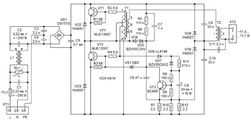 Важная особенность подобного преобразователя - он не запустится без нагрузки, поскольку при этом ток через обмотку III Т1 будет слишком мал, и трансформатор не войдет в насыщение, процесс автогенерации сорвется. Эта особенность делает ненужной защиту от режима холостого хода. Устройство с указанными на рис. 1 номиналами стабильно запускается при мощности нагрузки от 20 Вт. На рис. 4 приведена схема усовершенствованного электронного трансформатора, в который добавлены помехоподавляющий фильтр и узел защиты от короткого замыкания в нагрузке. Узел защиты собран на транзисторе VT3, диоде VD6, стабилитроне VD7, конденсаторе C8 и резисторах R7-R12. Резкое увеличение тока нагрузки приведет к увеличению напряжения на обмотках I и II трансформатора Т1 с 3...5 В в номинальном режиме до 9...10 В в режиме короткого замыкания. В результате на базе транзистора VT3 появится напряжение смещения 0,6 В. Транзистор откроется и зашунтирует конденсатор цепи запуска С6. В результате со следующим полупериодом выпрямленного напряжения генератор не запустится. Конденсатор С8 обеспечивает задержку отключения защиты около 0,5 с.