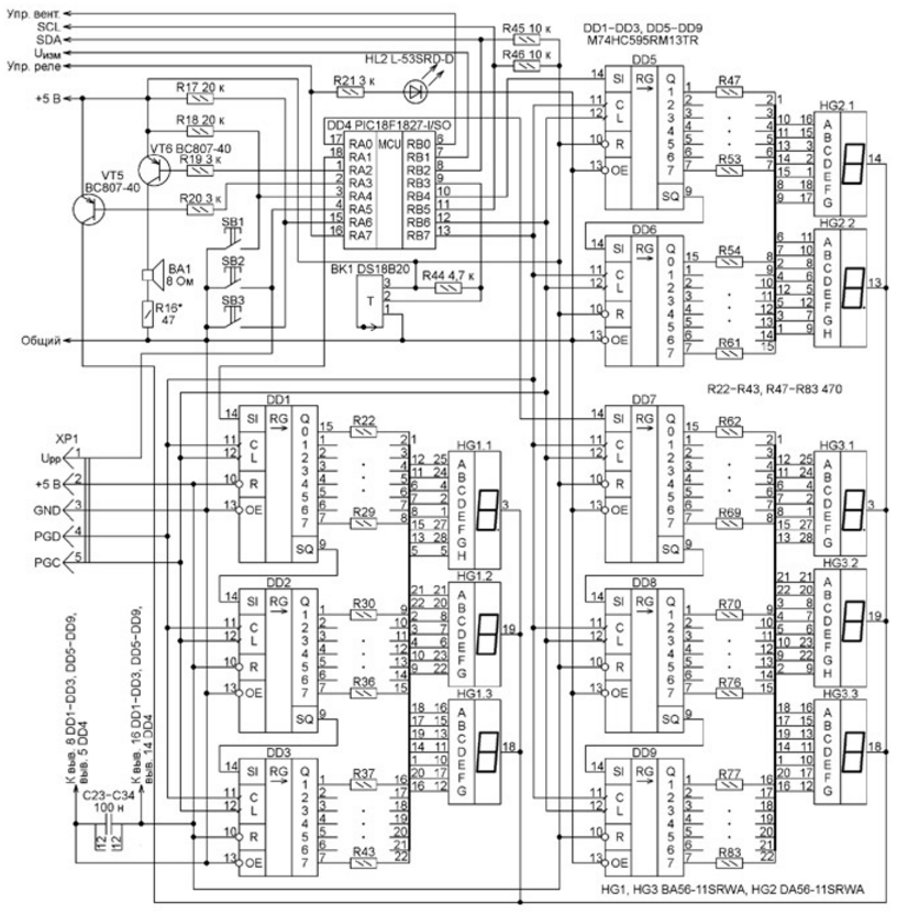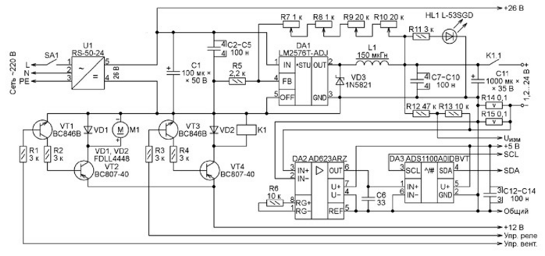 Все операции по считыванию контролируемых параметров с их датчиков, заданию режимов работы и выводу информации на индикаторы HG1-HG3 выполняет микроконтроллер DD4 PIC16F1827-I/SO, тактовая частота которого 4 МГц задана встроенным в него RC-генератором. Для программирования микроконтроллера предназначен разъем XP1. После подключения к сети 220 В источника питания RS-50-24 (U1) его напряжение поступает на регулируемый импульсный стабилизатор напряжения на микросхеме DA1 LM2576T-ADJ и на нерегулируемый стабилизатор DA4 КР142ЕН8Б. С помощью последнего получают напряжение 12 В для питания обмотки реле K1 и вентилятора M1. Далее интегральный стабилизатор DA5 КР142ЕН5А понижает напряжение+12 В до +5 В, необходимых для питания остальных узлов блока. В состав импульсного стабилизатора входят также диод Шоттки VD3, накопительный дроссель L1 и конденсаторы C7-C11. Его выходное напряжение регулируют переменными резисторами R7-R10. Их число увеличено для достижения желаемой плавности регулировки. На нагрузку блока стабилизированное напряжение поступает через контакты реле K1.1. Это сделано, чтобы можно было отключить нагрузку при срабатывании защиты или при необходимости выключить ее, не отсоединяя провода питания от блока. Независимо от состояния контактов K1.1 часть напряжения с выхода регулируемого стабилизатора через делитель напряжения на резисторах R12 и R13 поступает на вход АЦП микроконтроллера DD4, измеряется им, и значение напряжения на выходе стабилизатора выводится на индикатор HG3. Это позволяет установить нужное напряжение при выключенном выходе и только потом нажатием на кнопку SB3 подать команду замкнуть контакты K1.1. Когда они замкнуты, нажатие на эту же кнопку их размыкает. После подключения блока к сети и до нажатия на кнопку SB3 контакты разомкнуты. Датчиком тока нагрузки служит шунт, включенный в ее минусовый провод. Он составлен из резисторов R14 и R15, соединенных параллельно. Сопротивление шунта - 0,05 Ом. При токе нагрузки 2 А на нем падает напряжение до 0,1 В. Этого недостаточно для точного измерения тока, поэтому напряжение с датчика усиливает инструментальный усилитель DA2 AD623ARZ [2], коэффициент усиления которого 11 установлен резистором R6. С выхода этого усилителя пропорциональное току нагрузки напряжение поступает на вход 14-разрядного АЦП DA3 ADS1100A0IDBVT [3], в котором имеется внутренний усилитель на 2. Каждую секунду преобразователь выполняет преобразования, результаты десяти из которых микроконтроллер считывает по интерфейсу I2C. Применение внешнего АЦП связано с тем, что встроенный десятиразрядный АЦП микроконтроллера не обеспечивает измерение тока до 2 А с нужной точностью. Температуру теплоотвода стабилизатора DA1 измеряет укрепленный на нем датчик BK1 DS18B20 или DS18S20. Тип датчика программа микроконтроллера определяет автоматически. Если измеренная температура превышает на 2 °C и более заданное значение, то по команде микроконтроллера включается с помощью транзисторов VT1 и VT2 вентилятор M1, обдувающий теплоотвод. О работе вентилятора сигнализирует включенная десятичная запятая после младшего разряда индикатора HG2. Когда температура станет на 2 °C ниже заданной, вентилятор и запятая на индикаторе будут выключены. Когда датчик температуры отсутствует или неисправен, вентилятор работает непрерывно, а на индикаторе HG2 включены два минуса. Измеренное значение выходного 