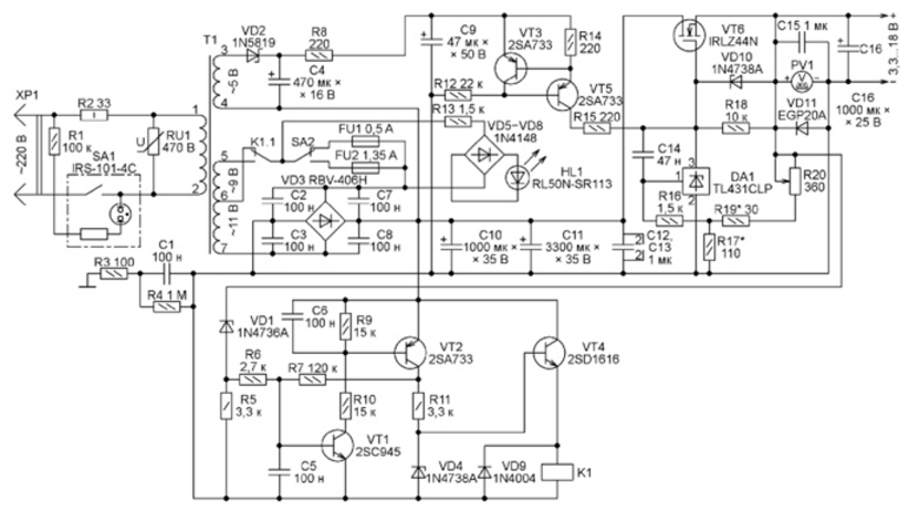 На рис. 1 представлена схема построенного по такому принципу компактного блока питания с линейным стабилизатором выходного напряжения, регулируемого в широких пределах. Устройство оснащено трехразрядным цифровым вольтметром, выдает стабилизированное выходное напряжение 3,3...18 В при токе нагрузки до 1,2 А. В [1] была описана конструкция, в которой также можно было переключить напряжение на входе стабилизатора, но только вручную. В новом блоке обмотки понижающего трансформатора T1 переключаются автоматически в зависимости от установленного выходного напряжения. Защита устройства от перегрузки по току выполнена, как и в [1], на самовосстанавливающихся предохранителях. Напряжение сети переменного тока 220 В поступает на первичную обмотку понижающего трансформатора T1 через замкнутые контакты сетевого выключателя с подсветкой SA1 и защитный резистор R2. Резистор R1 ограничивает ток через неоновую лампу подсветки выключателя, уменьшая яркость ее свечения и увеличивая срок службы. Варистор RU1 защищает от всплесков напряжения в сети. Трансформатор имеет две вторичные обмотки. Переменное напряжение с обмотки 5-6-7 трансформатора, имеющей отвод, поступает на выпрямительный мост VD3 через контакты реле K1.1, переключатель SA2 и самовосстанавливающийся предохранитель FU1 или FU2 (в зависимости от положения переключателя). Конденсаторы C10 и C11 сглаживают пульсации выпрямленного напряжения. Включенный в диагональ выпрямительного моста VD5-VD8 светодиод HL1 сигнализирует о срабатывании любого из самовосстанавливающихся предохранителей, резистор R13 ограничивает ток светодиода. Обмотка 3-4 предназначена для получения повышенного напряжения, необходимого для эффективного управления полевым транзистором VT6, служащим регулирующим элементом в стабилизаторе напряжения. Напряжение этой обмотки выпрямляет диод Шоттки VD2 и сглаживает фильтр C4R8C9. Этот узел позволяет обойтись без умножителя напряжения, который был использован в аналогичном стабилизаторе, описанном в [2]. В регулируемом стабилизаторе выходного напряжения в качестве узла сравнения и усилителя сигнала рассогласования применена микросхема параллельного стабилизатора напряжения DA1. Она питается током 3 мА, стабилизированным транзисторами VT3 и VT5. Точное значение этого тока зависит от сопротивления резистора R14. Питание параллельного стабилизатора стабильным током позволяет создать для него комфортные условия работы при значительном изменении напряжения на условном катоде (выводе 3). Конденсатор C14 и резистор R15 предотвращают самовозбуждение стабилизатора. Выходное напряжение стабилизатора регулируют переменным резистором R20. Чем меньше его введенное сопротивление, тем ниже напряжение на выходе блока - истоке полевого транзистора VT6. Стабилитрон VD10 защищает полевой транзистор от повреждения. Микросхема DA1 всегда поддерживает на своем катоде такое напряжение, при котором напряжение между ее управляющим входом (выводом 1) и условным анодом (выводом 2) равно 2,5 В. Резистор R16 - защитный. К выходу стабилизатора подключен цифровой вольтметр PV1. Диод VD11 защищает его от обратного напряжения, например, в случае подключения к выходу стабилизатора заряженного в обратной полярности конденсатора большой емкости. На транзисторах VT1, VT2, VT4, реле K1, стабилитронах VD1 и VD4, диоде VD9 собран узел переключения 