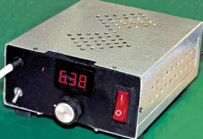 Изготовленный блок питания имеет компактную конструкцию, все детали размещены в готовом корпусе размерами 129x114x47 мм из листовой латуни толщиной 1 мм (рис. 2). Корпус используется и как эффективный теплоотвод. К нему прикреплены пластмассовые ножки высотой около 10 мм, что нужно для лучшего обтекания его воздухом, а следовательно, для лучшего охлаждения. Корпус не имеет непосредственного электрического соединения с общим проводом блока питания, но для выравнивания потенциалов соединен с ним цепью R3C1R4. Передняя панель блока изготовлена из листового полистирола.