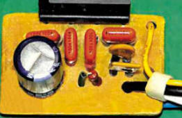 Поскольку почти половина объема корпуса занята трансформатором T1, расположение остальных элементов устройства внутри него довольно плотное. Узел выпрямителя на диодном мосте VD3 собран на отдельной монтажной плате, показанной на рис. 3. На ней также находятся конденсаторы C2, C3, C7, C8, C10, резистор R13, диоды VD5-VD8 и самовосстанавливающиеся предохранители. Остальные узлы размещены на плате, изображенной на рис. 4.