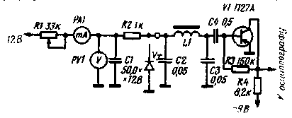Для проверки шумовых свойств диодов использовалось устройство (рис. 1), включающее входной каскад усилителя НЧ на транзисторе VI и фильтр нижних частот C2L1C3 с частотой среза 5 кГц. Частоты ниже 300 Гц ослаблялись из-за относительно небольшой емкости конденсатора С4. Уровень шума измерялся осциллографом С1-70 с высокочувствительным (10 мкВ/дел.) блоком 1У14. При использовании менее чувствительного осциллографа необходимо добавить 1-2 каскада усилителя НЧ.