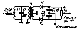 В радиоприемниках прямого преобразования (например, "Радио", 1973, № 7, с. 15, 16) высокочастотный входной сигнал преобразуется непосредственно в звуковые частоты. Для снижения перекрестных помех и помех, возникающих из-за непосредственного детектирования амплитудно-модулированных сигналов мощных станций, желательно иметь минимальное усиление по высокой частоте (до преобразования). При этом чувствительность приемника сильно зависит от типа и качества смесительных диодов. Особенно заметна низкочастотная компонента шума диодов, пропорциональная 1/f.