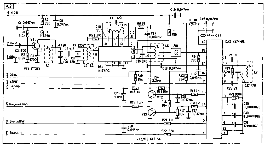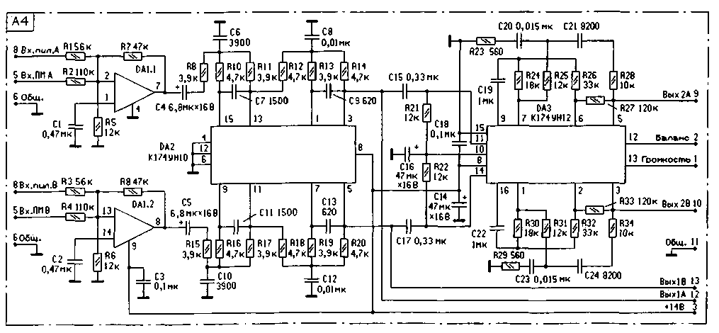 На микросхеме DA1 К548УН1 собран предварительный усилитель. Его назначение - нормировать уровни сигналов с выходов стереодекодеров. В качестве DA1 допустимо использовать любой малошумящий ОУ в стандартном включении. На микросхеме DA2 собран активный фильтр подавления остатков поднесущих частот комплексного стереосигнала. При отсутствии микросхемы К174УН10 фильтр можно собрать по любой другой схеме, например, так, как рекомендуется в [2]. Электронный регулятор громкости и стереобаланса собран на микросхеме DA3 блока А4 по типовой схеме. Регулирующее напряжение подается на выводы 13 и 12 этой микросхемы от блока управления. Сигнал с выходов "Вых. 1А" и "Вых. 1В" подается на внешний разъем для записи на магнитофон. Его уровень не зависит от регулировки громкости. С выходов "Вых. 2А" и "Вых. 2В" сигнал подается на усилитель мощности и на разъем, предназначенный для подключения внешнего высококачественного оконечного УНЧ. Усилитель мощности приемника (А5) выполнен на микросхеме К174УН14. Каких-либо особенностей он не имеет. Схема одного канала усилителя показана на рис. 4.