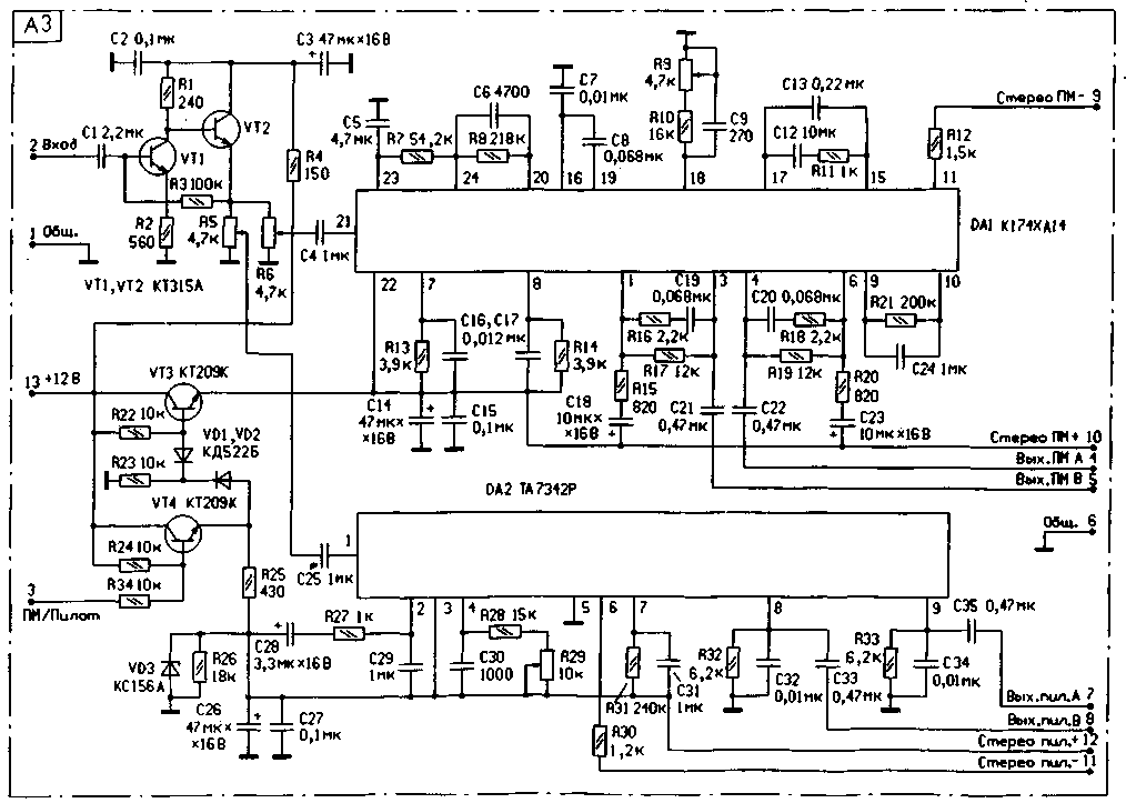 Микросхема ОД2 включена по типовой схеме и осуществляет основное усиление, ограничение и демодуляцию. Кроме того, она вырабатывает напряжение АПЧГ и сигнал настройки ("Настр."), подаваемый в блок управления. По получении этого сигнала блок управления снижает скорость перестройки приемника для облегчения точной предварительной настройки на станцию. С блока управления на вывод 2 микросхемы DA2 приходит сигнал "Блк. АПЧГ", отключающий АПЧГ на время перестройки приемника. Демодулированный НЧ сигнал с вывода 7 микросхемы DA2 через резистор R22 поступает на вход блока стереодекодеров (A3). Схема этого блока приведена на рис. 2. На транзисторах VT1, VT2 собран предварительный усилитель. Подстроенные резисторы R5 и R6 предназначены для выбора оптимального уровня входного сигнала для микросхем стереодекодеров DA2 и DA1 соответственно.