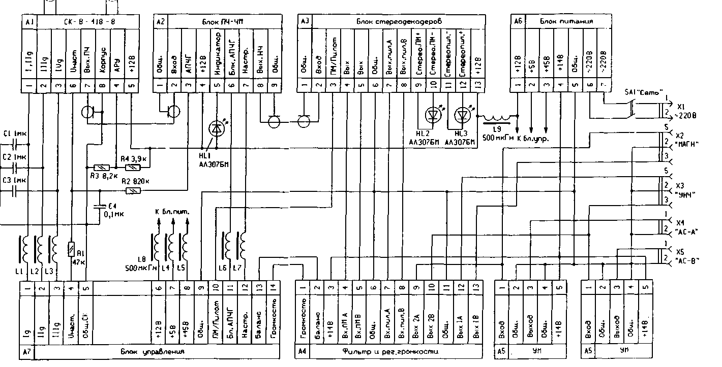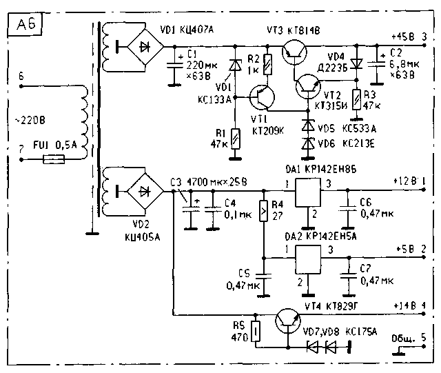 Блок питания (А6) собран по трансформаторной схеме, его схема приведена на рис. 5.