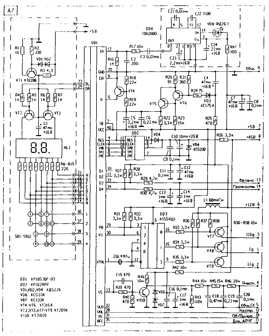 Блок управления приемника (А7) выполнен на основе"телевизионного" контроллера КР1853ВГ1-03. Его схема показана на рис. 6. В основном она повторяет схему системы настройки СН-44 для отечественных телевизоров 4-го поколения. Отличия заключаются в исключении дежурного режима и в схеме дешифратора диапазона.