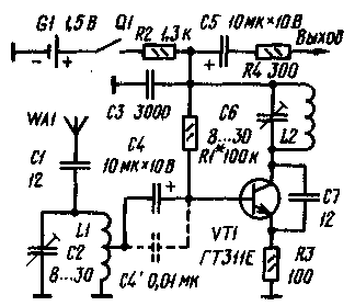 Катушка вариометра L2 содержит 16 витков провода ПЭВ-2 0.56, катушки L1 и L3 (бескаркасные, внутренний диаметр 5, шаг намотки 1 мм) - соответственно 6 (с отводом от середины) и 10 витков того же провода. Катушка L4 контура восстановления сигнала поднесущей частоты (155 витков) намотана проводом ПЭВ-2 0,2 на подвижном каркасе, размещенном на отрезке ферритового (М400НН) стержня диаметром 8 и длиной 20 мм. Обмотка дросселя L5 содержит 500 витков провода ПЭВ-2 0,1, магнитопровод - пермаллоевый из пластин Ш3Х6. Конденсатор С8 - КМ-5 с номинальным напряжением 50 В. При выборе конденсатора С3 следует учесть, что он должен обладать малой индуктивностью и малыми потерями в диапазоне принимаемых частот. Выключатель питания совмещен с разъемом Х2 (розетка ОНЦ-ВГ-4-5/16-р, вилка ОНЦ-ВГ-4-5/16-В), его функции выполняет перемычка, соединяющая контакты 1 и 4. Для устранения влияния рук на частоту гетеродина каскады на микросборке DA1 помещены в экран. В качестве антенны можно применить отрезок стальной проволоки длиной 20...30 см и диаметром 1...1.5 мм. Свободный конец проволоки следует согнуть, придав ему вид кольца. В приемник можно ввести электронную настройку (рис. 4, б). В этом случае его настраивают переменным резистором R18. с движка которого поступает напряжение смещения на варикап VD3. Резистор подключают непосредственно к источнику питания приемника. При напряжении 1,5 В удается перекрыть примерно половину диапазона. Вторую половину можно перекрыть, подав на варикап прямое смещение (в левом - по схеме - положении переключателя SA2). При использовании устройства с приемником по схеме на рис. 2 питающее напряжение следует подавать через развязывающий фильтр R19C20, а переключатель SA2 исключить. Налаживание приемника начинают с установки режима работы выходных каскадов подбором резисторов R11, R14 (до получения коллекторного тока покоя транзисторов VT5, VT6 в пределах 5...8 мА). Далее проверяют АЧХ стереодекодера. Для этого, замкнув накоротко катушку L2, подают на эмиттер транзистора DA1.1 сигнал ЗЧ напряжением в несколько милливольт. Выходной сигнал снимают с резистора R8, предварительно установив его движок в крайнее левое (по схеме) положение, а выключатель SA1 - в положение, показанное на схеме. Спад АЧХ на частоте 46,25 кГц не должен превышать 3 дБ (при необходимости этого добиваются подбором конденсатора С3), а ее подъем на частоте 31,25 кГц (при настроенном контуре L4C8) должен быть не менее 14 дБ (5 раз). Можно настроить стереодекодер и по принимаемому стереосигналу. Для этого параллельно контактам выключателя SA1 подсоединяют высокоомный милливольтметр и перемещением катушки L4 по ферритовому стержню настраивают контур восстановления под-несущей частоты по максимуму постоянной составляющей на выходе полярного детектора. При настроенном контуре она должна составлять 0.25...0,3 В, а при расстроенном или замкнутом накоротко - 0,05 В. Если необходимо, подбирают резистор R7, добиваясь максимального динамического диапазона каскада на транзисторе VT2. На рис. 5 приведена схема УКВ приставки к промышленному транзисторному приемнику "ВЭФ-202" [3] (в скобках указаны позиционные обозначения его деталей по заводской схеме). Приставку монтируют в барабанном переключателе на планке диапазона 52.. 75 м. Для перестройки по диапазону используют одну из секций конденсатора переменной емкости С3, прием ведут на телескопическую антенну
