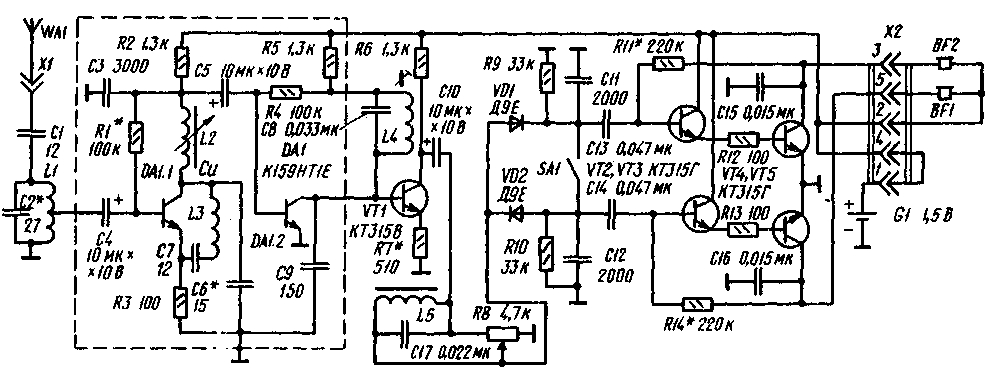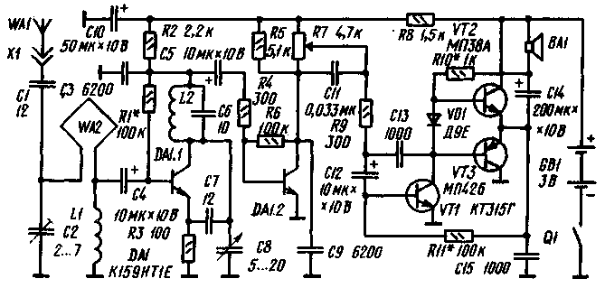 Как гетеродин, транзистор VT1 включен по схеме ОБ, а как преобразователь частоты - по схеме ОЭ. Входной сигнал поступает на базу транзистора с широкополосного контура L1C2, настроенного на среднюю (70МГц) частоту принимаемого диапазона. Гетеродин перестраивается в диапазоне частот 32,9...36,5 МГц, так что частота его второй гармоники лежит в границах радиовещательного УКВ диапазона (65,8...73 МГц). Эффективность работы приемника зависит от уровня второй гармоники колебаний гетеродина в коллекторном токе транзистора VT1. С целью повышения амплитуды этой составляющей емкость конденсатора положительной обратной связи С7 выбрана в 2...3 раза большей, чем это требуется для генерации на основной частоте. Как синхронный детектор, транзистор VT1 включен по схеме ОБ. Он обеспечивает усиление сигнала звуковой (промежуточной) частоты, примерно равное отношению сопротивлений резисторов R2/R3. Цепь R2C3 блокирует гетеродин по радиочастоте и является нагрузкой синхронного детектора. Постоянная времени этой цепи позволяет пропустить всю полосу частот, занимаемую комплексным стерсосигналом (КСС). При приеме только монофонических передач емкость конденсатора С3 можно увеличить до получения стандартного значения постоянной времени 50 мкс. Напряжение на выходе приемника равно 10...30 мВ (этого достаточно, чтобы слушать радиопередачи на телефоны, включенные вместо резистора R2) и не зависит от уровня сигнала принимаемой радиостанции. Описанный приемник по чувствительности не уступает сверхрегенеративному, но в отличие от него не "шумит" в отсутствие сигнала. При настройке гетеродина на частоту, вдвое меньшую частоты радиостанции, происходит захват, сопровождаемый щелчком, после чего в некоторой полосе удержания приемник "следит" за частотой принимаемого сигнала, осуществляя его синхронное детектирование. ФАПЧ и хорошая развязка входного и гетеродинного контуров (вследствие большой разницы в частотах их настройки) обусловили незначительное излучение в антенну и позволили отказаться от усилителя радиочастоты. Недостаток приемника - чрезмерное расширение полосы удержания при сильных сигналах и их прямое детектирование, однако это в той или иной мере свойственно всем ЧМ приемникам прямого преобразования с ФАПЧ. В приемнике можно использовать и кремниевые транзисторы (например. КТ315В). Катушки L1, L2 - бескаркасные (внутренний диаметр 5 мм, шаг намотки 1 мм) и содержат соответственно 6 (с отводом от середины) и 20 витков провода ПЭВ-2 0,56. Принципиальная схема карманного радиоприемника, обеспечивающего громкоговорящий прием, показана на рис. 2. Прием ведется на рамочную антенну WA2, настроенную конденсатором С2 на середину радиовещательного УКВ диапазона. Катушка L1 служит для связи антенны с приемным устройством, которое собрано на одном из транзисторов микросборки DA1 и перестраивается по диапазону конденсатором С8. Предварительный усилитель ЗЧ выполнен на другом транзисторе микросборки, оконечный - на транзисторах VT1-VT3. Выходная мощность усилителя на нагрузке сопротивлением 8 Ом (динамическая головка 0,25ГД-10) при питании от двух элементов А332 (3 В) - 50 мВт. При приеме слабых сигналов рекомендуется использовать внешнюю антенну WA1, подключаемую через разъем X1.