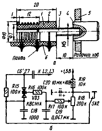 Буферный каскад на транзисторе VT1 связан с предыдущим непосредственно. Он имеет малый коэффициент передачи по напряжению (около двух), высокое входное сопротивление и не шунтирует цепь восстановления поднесущей частоты. С коллектора транзистора VT1 полярно-модулированиые колебания через регулятор громкости R8 поступают на полярный детектор, выполненный на диодах VD1, VD2 С целью упрощения конструкции регулятор громкости включен перед детектором. Элементы L5 и С17 обеспечивают тонкомпенсацию соответственно на низших и высших звуковых частотах. Полярный детектор нагружен цепями R9C11 и R10C12. компенсирующими предыскажения исходных стереосигналов. При приеме монофонических передач полярный детектор замыкают накоротко переключателем SA1. Стереофонический усилитель ЗЧ собран на транзисторах VT2- VT5, Выходной каскад работает в режиме А. Выходная мощность усилителя на нагрузке сопротивлением 8 Ом - 1...2 мВт, потребляемый ток - 7...8 мА. Усилитель может работать и на стереотелефоны сопротивлением 8...100 Ом. Конструкция вариометра показана на рис. 4,а. Его корпус 1 выточен из фторопласта, внутри нарезана резьба М5. Крепежный хомутик 2 выполнен из медного провода диаметром 0,5 мм, шпилька-подстроечник 3 - из латуни. Ручка настройки 4 - любая готовая или самодельная. Цифрой 5 обозначен корпус приемника, 6 - монтажная плата.