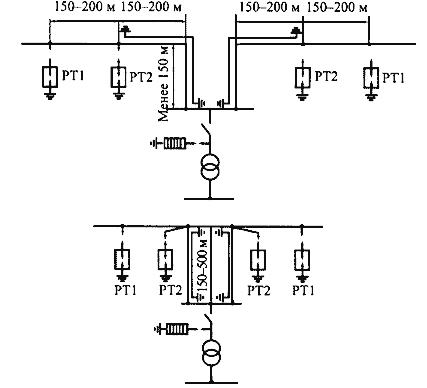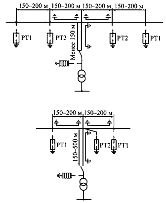 При длине подхода более 500 м установка комплекта трубчатых разрядников РТ1 не требуется. Защита ПС, на которых расстояния между РВ и трансформатором превышают 10 м, выполняется в соответствии с требованиями, приведенными в 4.2.148. Упрощенную защиту ПС, в соответствии с указанными выше требованиями, допускается выполнять и в случае присоединения ПС к действующим ВЛ с помощью коротких подходов (рис. 4.2.19). При этом трансформаторы должны быть защищены РВ II группы или соответствующими ОПН. Выполнение упрощенной защиты ПС, присоединенных к вновь сооружаемым ВЛ, не допускается.
