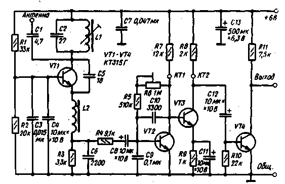 В передатчике не предусмотрено специальных мер для согласования колебательного контура передатчика с антенной, поэтому излучаемая мощность передатчика невелика, и радиус действия системы радиоуправления составляет 5...10 м. Для повышения дальности можно повысить напряжение питания передатчика до 9 В и применить согласующий CLC-контур и удлиняющую катушку. Схема приемника системы радиоуправления приведена на рис.2. Входной каскад приемника собран по схеме сверхрегенеративного детектора ва транзисторе VT1. Сверхрегенератор обладает замечательными свойствами - высокой чувствительностью, малой