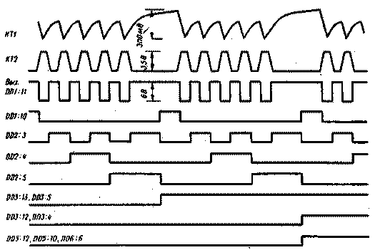 зависимостью уровня выходного сигнала от уровня входного, простотой, однако ему свойственны и недостатки - малая избирательность, излучение сигнала, в результате которого он работает как маломощный передатчик и может мешать другим приемникам. Работа сверхрегенеративного детектора описана во многих книгах по радиоуправлению и здесь не рассматривается. На нагрузочном резисторе R3 входного каскада выделяются кроме полезного сигнала пилообразные импульсы гашения с частотой 40...60 кГц, для их фильтрации используется цепь R4 С9, для этой же цели служит конденсатор С10. Эти же элементы подавляют кратковременные импульсные помехи (например, от электродвигателей модели) и частично шумы сверхрегенеративного детектора. Примерная форма полезного сигнала на коллекторе транзистора VT2, работающего в режиме линейного усиления, показана на первой диаграмме рис.3. Этот сигнал еще далек от пачек импульсов, необходимых для работы дешифратора. Для получения хорошей прямоугольной формы импульсов служит усилитель-формирователь на транзисторе VT3. При отсутствии полезного сигнала, когда на коллекторе транзистора VT2 существует шумовой сигнал сверхрегенератора небольшой амплитуды, транзистор VT3 находится в состоянии неглубокого насыщения, напряжение между его коллектором и эмиттером составляет 250...300 мВ и он не усиливает входной сигнал. Такая рабочая точка транзистора VT3 устанавливается подстроечным резистором R6.