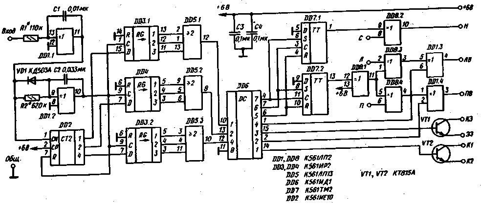 При появлении пачек радиочастотных импульсов сверхрегенеративный детектор подает на базу транзистора VT2 пачки импульсов положительной полярности, на коллекторе VT2 и базе VT3 появляются сигналы в соответствии с первой диаграммой рис.3. Отрицательная полуволна сигнала закрывает транзистор VT3, и на его коллекторе формируются импульсы положительной полярности, открывающие ключевой каскад на транзисторе VT4. На его коллекторе формируются пачки импульсов отрицательной полярности с амплитудой, равной напряжению источника питания, они подаются на вход дешифратора команд. Схема дешифратора команд приведена на рис.4. Пачки входных импульсов отрицательной полярности поступают на часть дешифратора на микросхемах DD1 и DD2. После приема очередной пачки импульсов счетчик DD2 устанавливается в состояние, соответствующее числу импульсов в пачке. В качестве примера на рис.3 проиллюстрирована работа счетчика в случае приема пачек из пяти импульсов. К моменту окончания пачки на выходах 1 и 4 счетчика появляются лог. 1, на выходе 2-лог.0 (диаграммы DD2:3, DD2:4, DD2:5 на рис.3). Фронтом импульса с детектора паузы DD1.2 происходит перепись состояния счетчика в сдвигающие регистры DD3.1, DD4, DD3.2, в результате чего на их выходах 1 появляются соответственно лог. 1, лог.0, лог.1.