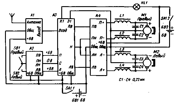 Если не нажата ни одна из кнопок передатчика, на выходах 1,2,4 счетчика после окончания пачки из восьми импульсов лог.0 и на всех используемых выходах дешифратора DD6 также лог.0. В табл.1 приведены соответствие команд числу импульсов пачек и выходные сигналы дешифратора системы. Пачка из пяти импульсов - это команда "Стоп", при ее приеме, как уже указывалось выше, лог.1 появляется на выходе 5 DD6. Эта лог.1 поступает на входы R триггеров DD7.1 и DD7.2 и устанавливает их в 0. Мы пока не будем рассматривать роль микросхемы DD8 и будем считать, что сигнал при прохождении ее элементов не меняется. В результате приема команды "Стоп" на выходах ПВ, ЛВ и Н (назад) будут лог.0, двигатели, подключенные к указанным выходам через усилители, будут остановлены. При подаче команды "Вперед" лог.1 появится на выходе 6 DD6, она установит триггер DD7.2 по входу S в состояние 1, триггер DD7.1 независимо от своего исходного состояния установится в состояние О по входу С, так как на его входе D лог.0. В результате на выходах ПВ и ЛВ появятся лог.1, на выходе Н - лог.0, оба двигателя планетохо-да будут вращаться, обеспечивая движение модели вперед. При подаче команды "Назад" триггер DD7.1 будет в состоянии 1, DD7.2 - в состоянии 0, двигатели обеспечат движение модели назад. Указанные команды хранятся в триггерах микросхемы DD7 и после отпускания кнопок SB5-SB7. Предположим, что при движении модели вперед будет нажата кнопка SB2 "Вправо". В этом случае лог.1 появится на выходе 2 DD6, она поступит на вывод 2 элемента DD1.4 и изменит лог.1 на его выходе на лог.0. В результате сигнал ПВ станет равным нулю, и правый двигатель остановится. Модель будет разворачиваться вправо за счет левой гусеницы (вторая строка табл.1). При движении назад нажатие кнопки SB2 также заставит измениться сигнал на выходе элемента DD1.4 на противоположный, но теперь уже с лог.0 на лог.1, правый двигатель также затормозится и модель также будет разворачиваться вправо. Аналогично ведет себя модель и при нажатии кнопки SB4 "Влево". Команды "Вправо" и "Влево" не запоминаются, они действуют лишь во время нажатия соответствующей кнопки. Аналогично не запоминаются и команды "Фары" и "Сигнал" (SB1 и SB3). При нажатии на эти кнопки включаются соответственно транзисторы VT2 и VT1. Их базы подключены к выходам дешифратора DD6 без ограничительных резисторов, что допустимо при напряжении питания микросхем серии К561 в пределах 3...6 В. Микросхема DD8 служит для сопряжения дешифратора системы радиоуправления с платой планетохода, обеспечивающей маневр при объезде препятствий. Использование микросхемы Исключающее ИЛИ обеспечивает управляемость модели и в те моменты времени, когда она выполняет автоматический маневр. Полная схема соединения узлов планетохода приведена на рис.5. Здесь А1 - приемник по схеме рис.2, А2 - плата с микросхемами DD1-DD4 рис.211, A3 - дешифратор системы по схеме рис.4, А4 - усилители двигателей. На схеме рис.5 показано также подключение лампы фары HL1. Автором не была использована команда "Сигнал", источник звукового сигнала может быть включен в коллекторную цепь транзистора VT1 аналогично включению HL1 в цепь коллектора VT2.'