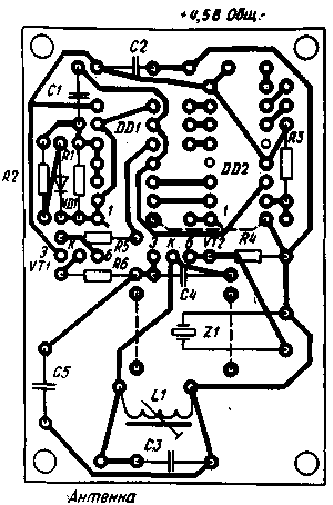Питание электродвигателей и узлов А1-АЗ разделено для исключения влияния помех от двигателей на электронную часть планетохода. Общие провода обеих цепей питания объединяются лишь в узле А4, на это надо обратить внимание при монтаже. Для исключения влияния помех от двигателей в их цепи питания включены дроссели L1-L4 и конденсаторы С1-С4, металлические корпуса двигателей соединены с общим проводом. При отсутствии узла А2 на входы П, Л, С узла A3 можно подать напряжения в соответствии с указаниями на рис.5, можно также исключить микросхему DD8 на рис.4, соединив непосредственно выход триггера DD7.1 с выходом Н6, а выход триггера DD7.2 со входами DD 1.3 и DD 1.4. Все узлы системы радиоуправления собраны на печатных платах: передатчик - на односторонней с размерами 60х40 мм (рисунок 6), приемник - на односторонней с размерами 105х40 мм (рисунок 7), дешифратор - на двухсторонней с теми же размерами (рисунок 8). На указанных рисунках односторонние платы показаны со стороны, противоположной стороне установки деталей, плата дешифратора - с двух сторон. В системе радиоуправления использованы резисторы МЛТ, керамические конденсаторы КТМ (С1 на рис.2), КМ-5 и КМ-6, электролитические конденсаторы К50-6 (С4, С8, C11, C12 на рис.2), К50-16 (С13 на рис.2). Подстроенный резистор R6 на рис.2 типа СПЗ-16, его выводы отогнуты под прямым углом. В системе использованы стандартные дроссели ДМ-0,2 30 мкГн (L2 на рис.2) и ДМ-3 12 мкГн (L1-L4 на рис.5), можно использовать и самодельные с близкими параметрами. Кварцевый резонатор в передатчике - в стеклянном корпусе диаметром 10 мм на частоту 27,12 или 28...28,2 МГц. При отсутствии кварцевого резонатора передатчик можно собрать по любой из опубликованных схем, сохранив схему формирователя пачек и модулятора по рис.1. Катушка L1 колебательного контура передатчика намотана на каркасе диаметром 5 мм и подстраивается сердечником из карбонильного железа диаметром 4 мм и длиной 6 мм. Она содержит 12 витков провода ПЭЛШО-0,38. Катушка L1 приемника намотана на каркасе диаметром 8 мм тем же проводом и содержит 9 витков, она подстраивается сердечником из карбонильного железа диаметром б мм. В передатчике можно использовать такую же катушку, как и в приемнике. Батарея питания передатчика - 3336, на модели для питания двигателей использованы четыре элемента А343, электронная часть работает от четырех элементов A316. Антенной приемника служит велосипедная спица длиной 300 мм, антенна передатчика телескопическая, состоит из четырех колен общей длиной 480 мм. Передатчик собран в пластмассовом корпусе с размерами 75х1500x30 мм, в нем установлен специальный пульт управления, описанный далее. Сборку системы радиоуправления и ее настройку нужно проводить в следующей последовательности. На плате передатчика необходимо собрать цифровую часть, установить все резисторы, кроме R5, и транзисторы, но не устанавливать кварцевый резонатор, катушку L1 и конденсаторы C3-С5. Подбором резисторов R1 и R2 установить частоту импульсов на выходе DD1.2 180...220 Гц со скважностью, близкой к 2, затем проверить правильность генерации пачек так, как это описано выше. Затем можно собрать дешифратор команд и, установив в передатчик резистор R5, соединить коллектор транзистора VT1 передатчика со входом дешифратора. Напряжение питания обеих плат можно использовать общее 4,5 В. Нагрузкой транзистора VT1 передатчика будут последовательно соединенн