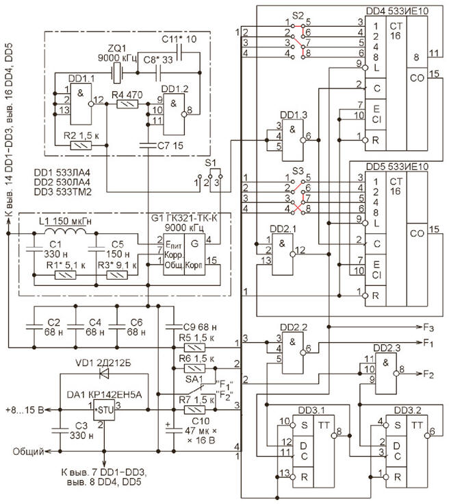 ЭНЦИКЛОПЕДИЯ РАДИОЭЛЕКТРОНИКИ И ЭЛЕКТРОТЕХНИКИ Генератор двух образцовых частот для синтезаторов вещательных передатчиков. Энциклопедия радиоэлектроники и электротехники Энциклопедия радиоэлектроники и электротехники / Гражданская радиосвязь Этот генератор предназначен для формирования сигналов двух переключаемых стабильных частот. В частности, он может быть использован в составе синтезаторов для индивидуального радиовещания при формировании как средневолновой вещательной сетки с шагом 9 кГц, так и коротковолновой с шагом 5 кГц. Но этим область его применения не ограничивается. Возможность использовать интегральные генераторы и кварцевые резонаторы на различные частоты совместно с широкими пределами изменения коэффициентов деления позволяет использовать эту конструкцию в других устройствах. Относительная стабильность частоты генератора 0,5·10-6 оС-1 в интервале температуры от -10 до +60 оС обеспечивается термокомпенсированным кварцевым генератором ГК321-ТК-К-9М-5В [1]. Предусмотрена возможность заменить его обычным кварцевым генератором на логических элементах. Однако стабильность частоты в этом случае будет хуже. В генераторе имеется делитель частоты с переменным коэффициентом деления, задаваемым двумя переключаемыми наборами перемычек, соответствующими двум значениям выходной может быть выбран любым четным в интервале от 2 до 512, второй - любым, кратным 4, в интервале от 4 до 1024. Коэффициент деления (выходную частоту) выбирают переключателем на два положения. Схема генератора изображена на рис.1. Интегральный термокомпенсированный кварцевый генератор G1 (ГК321-ТК-К-9М-5В) включен по схеме, рекомендованной предприятием-изго-товителем. Дополнительно в цепи его питания установлен развязывающий фильтр из дросселя L1 и конденсаторов C1 и C5. Если перемычка S1 установлена в положение 2-3, сигнал генератора поступает на буферный усилитель на логическом элементе 3И-НЕ DD1.3, включенном инвертором.