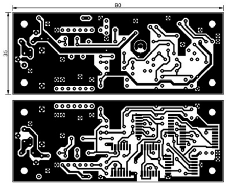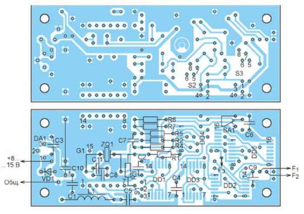 Если применен кварцевый генератор на другую частоту (она может достигать 20 МГц) или необходимо получить на выходах иные значения частоты, то расчеты, аналогичные приведенным выше, придется произвести самостоятельно и установить перемычки в соответствии с их результатами. При необходимости получить более двух значений выходной частоты и оперативно переключать их можно, применив вместо наборов перемычек два кодовых переключателя на 16 положений каждый. Все детали генератора смонтированы на двусторонней печатной плате (рис. 2) размерами 90x35 мм из фольгированного стеклотекстолита толщиной 1,5 мм, изготовленной по технологии с металлизированными отверстиями. Если металлизировать их не представляется возможным, то придется выводы деталей пропаивать с обеих сторон, а в переходные отверстия впаивать отрезки луженого провода.