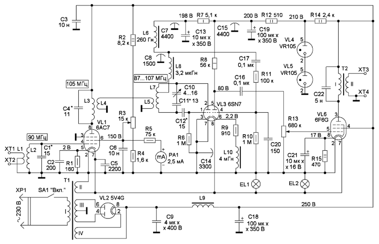 УВЧ представляет собой диапазонный усилитель с разнесенной настройкой контуров. Его задачи - усиление высокочастотных колебаний, поступающих с антенны, и предотвращение проникновения в нее и излучения в эфир собственных высокочастотных колебаний сверхрегенеративного детектора. УВЧ собран на высокочастотном пентоде 6AC7 (аналог - 6Ж4). Связь антенны с входным контуром L2C1 осуществляется с помощью катушки связи L1. Входное сопротивление каскада - 300 Ом. Входной контур в сеточной цепи лампы VL1 настроен на частоту 90 МГц. Настройка осуществляется подбором конденсатора С1. Контур L3C4 в анодной цепи лампы VL1 настроен на частоту 105 МГц. Настройка осуществляется подбором конденсатора С4. При такой настройке контуров максимальное усиление УВЧ - около 15 дБ, а неравномерность АЧХ в диапазоне частот 87...108 МГц - около 6 дБ. Связь с последующим каскадом (сверхрегенеративным детектором) осуществляется с помощью катушки связи L4. С помощью переменного резистора R3 можно менять напряжение на экранной сетке лампы VL1 от 150 до 20 В и тем самым изменять коэффициент передачи УВЧ от 15 до -20 дБ. Резистор R1 служит для автоматического формирования напряжения смещения (2 В). Конденсатор С2, шунтирующий резистор R1, устраняет обратную связь по переменному току. Конденсаторы С3, С5 и С6 - блокировочные. Напряжения на выводах лампы VL1 указаны для верхнего по схеме положения движка резистора R3. Сверхрегенеративный детектор собран на левой половине двойного триода VL3 6SN7 (аналог - 6Н8С). Контур сверхрегенератора образован катушкой индуктивности L7 и конденсаторами С10 и С11. Переменный конденсатор С10 служит для перестройки контура в диапазоне 87...108 МГц, а конденсатор С11 - для "укладки" границ этого диапазона. В сеточной цепи триода сверхрегенеративного детектора включен так называемый "гридлик", образованный конденсатором С12 и резистором R6. Подборкой конденсатора С12 устанавливают частоту гашения около 40 кГц. Связь контура сверхрегенератора с УВЧ осуществляется с помощью катушки связи L5. Напряжение питания анодной цепи сверхрегенератора поступает на отвод контурной катушки L7. Дроссель L8 - нагрузка сверхрегенератора по высокой частоте, дроссель L6 - по низкой. Резистор R7 совместно с конденсаторами С7 и С13 образуют фильтр в цепи питания, конденсаторы С8, С14, С15- блокировочные. Сигнал ЗЧ через конденсатор С17 и ФНЧ R11C20 с частотой среза 10 кГц поступает на вход предварительного УЗЧ. Предварительный УЗЧ собран на правой (по схеме) половине триода VL3. В катодную цепь включены резистор R9 для автоматического формирования напряжения смещения (2,2 В) на сетке и дроссель L10, который снижает усиление на частотах выше 10 кГц и служит для предотвращения проникновения импульсов гашения сверхрегенератора в оконечный УЗЧ. С анода правого триода VL3 через разделительный конденсатор С16 сигнал ЗЧ поступает на переменный резистор R13, выполняющий функцию регулятора громкости. Оконечный УЗЧ собран на мощном пентоде VL6 6F6G (аналог - 6Ф6С). Низкочастотный сигнал на сетку этой лампы поступает с переменного резистора R13. В катодной цепи VL6 включен резистор R15, служащий для автоматического формирования напряжения смещения 17 В. Для устранения отрицательной обратной связи по переменному току резистор R15 зашунтирован конденсатором С21. Для согласования с низкоомной динамической головкой в анодной цепи лампы VL6 установ