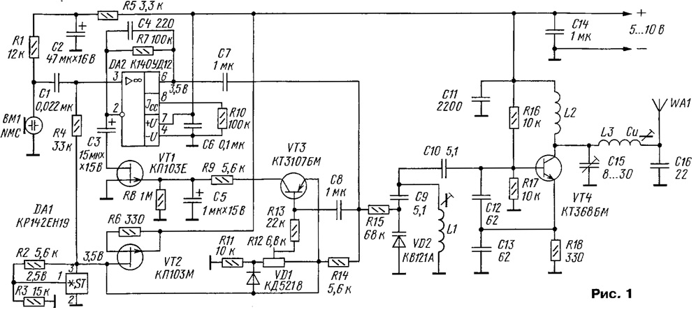 ЭНЦИКЛОПЕДИЯ РАДИОЭЛЕКТРОНИКИ И ЭЛЕКТРОТЕХНИКИ Радиомикрофон. Энциклопедия радиоэлектроники и электротехники Энциклопедия радиоэлектроники и электротехники / Гражданская радиосвязь О популярности радиомикрофонов слова излишни, все чаще любое выступление с эстрады, митинг, собрание, общественное мероприятие не обходится без них. Поскольку промышленные устройства среднего и высокого класса дороги и малодоступны, радиолюбителям здесь открыто широкое поле деятельности. Ниже мы предлагаем описание любительского радиомикрофона, хорошо спроектированного и отличающегося улучшенными параметрами по сравнению с параметрами других самоделок. Данный радиомикрофон предназначен для озвучивания мероприятий, прослушивания детской комнаты и т. д. Устройство работает в УКВ диапазоне на частоте 87,9 МГц, специально отведенной для радиомикрофонов, и его сигналы принимают на обычный радиовещательный приемник с диапазоном УКВ-2. Дальность действия радиомикрофона в пределах прямой видимости - более 200 м В отличие от описанных ранее [1] аналогичных конструкций, этот радиомикрофон сложнее, но обладает рядом преимуществ. В нем имеется АРУ микрофонного усилителя, что позволяет улавливать слабые звуки и устраняет сильные нелинейные искажения при громких звуках, направленных непосредственно в микрофон. У описываемого радиомикрофона относительно высокая стабильность частоты и хорошее использование питающей батареи, в частности, его работоспособность сохраняется при снижении напряжения питания от 10 до 5 В. Схема и принцип действия. Схема радиомикрофона приведена на рис. 1. Передатчик собран на транзисторе VT4 по однокаскадной схеме. Такое решение для миниатюрного устройства, каким является радиомикрофон, оправдано, так как использование в передатчике отдельно задающего генератора и выходного каскада приводит к снижению его экономичности и возрастанию габаритов. Как известно, частота LC-генератора, работающего в области 100 МГц, существенно зависит от напряжения питания. К примеру, автор исследовал широко распространенную емкостную "трехтонку" с включением транзистора по схеме с общей базой. По такой схеме включен передатчик радиомикрофона, описанного в [1]. Уход частоты генератора составил более 1 МГц при изменении питающего напряжения от 5 до 10 В. Введение в радиомикрофон стабилизатора напряжения привело бы к увеличению потерь. Поэтому в рассматриваемом устройстве передатчик питается непосредственно от источника. В отличие от описанных ранее, передатчик содержит два контура - контур L1C9C10C12C13VD2, задающий частоту генератора, и выходной контур L3C15C16, связанный с антенной. Это повышает стабильность генерируемой частоты. Задающий контур подключен к транзистору VT4 по схеме Клаппа, рекомендуемой для построения задающих генераторов передатчиков [2]. Влияние изменения параметров транзистора VT4 при изменении питающего напряжения на задающий контур сведено к минимуму выбором малого коэффициента включения транзистора в контур (определяется емкостью конденсаторов С10, С12, С13). Для повышения температурной стабильности частоты применены конденсаторы С9, С10, С12, С13 с малым ТКЕ, а коэффициент включения в задающий контур варикапа VD2 невелик из-за малой емкости конденсатора С9. Выходной П-контур позволяет согласовать антенну с выходом транзистора VT4 