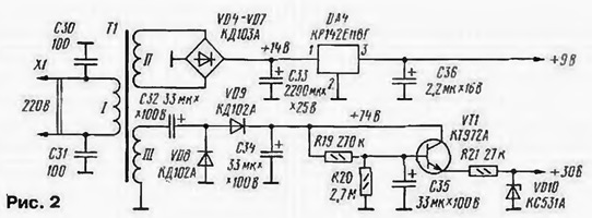 Кроме того, на участках диапазона частот, не отведенных для вещания, будут приниматься станции зеркального канала приема. Например, диапазон 65.8.-74 МГц будет приниматься как зеркальный при настройке приемника на частоты 52.8...61 МГц. Если частоту гетеродина выбрать ниже частоты сигнала, картина изменится, но не улучшится, и создаст дополнительную проблему - коэффициент перекрытия по частоте гегеродина придется увеличить с 1.92 до 2.18. В силу указанных выше причин было принято решение выполнить приемник с использованием телевизионных нормализованных узлов и двойным преобразованием частоты. Схема приемника приведена на рис. 1. Первая ПЧ - 32 МГц. вторая - 6.5 МГц. Первая ПЧ примерно соответствует первой ПЧ звука стандартных телевизионных приемников. Выбрана она так. чтобы зеркальный канал был расположен между 5-м и 6-м телевизионными каналами (несущая звука 5-го канала - 99.75 МГц. несущая изображения 6-го канала - 175.25 МГц). Частота первого гетеродина приемника выше частоты входного сигнала, при этом зеркальный канал приема по первой ПЧ оказывается в диапазоне 117... J72 МГц. Входной контур L2C2VD1 имеет индуктивную связь с антенным входом. Для обеспечения большей добротности вход микросхемы DA1 (К174ПС1) подключен к части витков катушки 12. Контур перестраивается в диапазоне 53... 108 МГц варикапом VD1. Первый преобразователь выполнен на микросхеме DA1. его гетеродин с колебательным контуром L3C4-C9VD2 имеет частоту перестройки в пределах 85... 140 МГц. Настройка на принимаемые станции осуществляется переключателем диапазона SA1 (ступенчатое изменение напряжения на варикапах) и переменными резисторами R8 и R9 (плавное изменение напряжения) - для каждого поддиапазона свой орган настройки. Такое построение позволяет сохранить настройку приемника на не используемом в данный момент поддиапазоне. Переключатель SA2 выполняет роль включения и отключения системы АПЧГ. Первая промежуточная частота (32 МГц) выделяется контуром L4C10 и через катушку связи L5 подается на вход второго преобразователя частоты, собранного на микросхеме DA2. Частота второго гетеродина (контур L6C13-C16) фиксирована и равна 38,5 МГц. Поэтому при настройке приемника на частоту приема 77 МГц будет принята немодулированная несущая - вторая гармоника сигнала второго гетеродина. Именно эта единственная пораженная точка и выбрана точкой разделения на два диапазона принимаемых приемником частот. Для преобразования симметричного выходного сигнала второго преобразователя частоты в несимметричный и согласования высокого выходного сопротивления DA2 с низким входным сборки А1 служит контур L7C17 с катушкой связи L8. настроенный на частоту 6.5 МГц Конденсатор С24 необходим для компенсации частотных предыскажений, вносимых на передающей стороне. УМЗЧ собран на микросхеме DA3. Приемник питается от сетевого блока, принципиальная схема которого показана на рис. 2. Потребляемый ток по цепи +9 В в режиме молчания - примерно 30 мА. Он в основном определяется током модуля УПЧЗ-2. Однополупериодный выпрямитель на диодах VD8, VD9 формирует на фильтрующем конденсаторе C34 постоянное напряжение, равное удвоенной амплитуде переменного напряжения, снимаемого с обмотки III Т1 (-28 В). Для лучшей фильтрации применен активный фильтр на транзисторе VT1 типа КТ972. Выходное напряжение стабилизировано цепью R21VD10. Схема удвоения с последующим формированием 