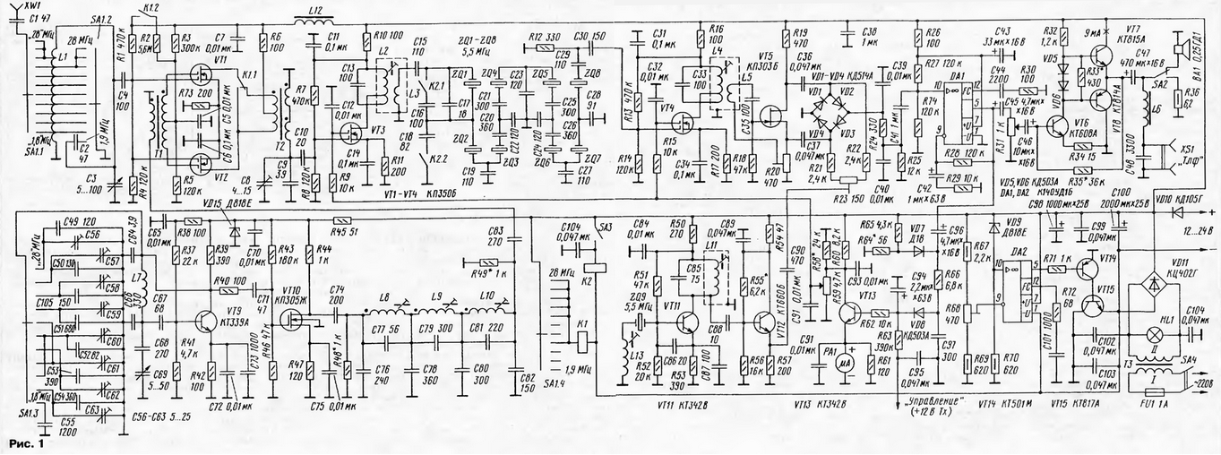 Питание может осуществляться от сети переменного тока 220 В или от источника постоянного тока напряжением 12...24 В. Схема приемника изображена на рис. 1. Он представляет собой супергетеродин с одним преобразованием частоты. РЧ сигнал через антенное гнездо XW1 и конденсатор С1 поступает через переключатель SA1.1 на часть катушки L1, образующей вместе с конденсатором переменной емкости (КПЕ) C3 входной контур. Перестройка приемника с диапазона на диапазон осуществляется замыканием соответствующей части витков катушки секцией переключателя диапазонов SA1.2. Секция переключателя SA1.1 на любом из диапазонов подключает к антенне только часть витков (примерно половину) катушки входного контура, обеспечивая этим приемлемое согласование с антенной. В диапазоне 1,8 МГц параллельно КПЕ C3 подключается конденсатор С2, благодаря чему обеспечивается возможность настройки в данном диапазоне частот с одновременным уменьшением коэффициента перекрытия по частоте. РЧ сигнал с входного контура через С4 поступает на первые затворы полевых транзисторов VT1 и VT2, на которых выполнен переключаемый балансный смеситель. Коэффициент передачи этого каскада приемника - около 8. На вторые затворы транзисторов через трансформатор Т1 в противофазе подается сигнал ГПД (генератора плавного диапазона), выполненного на транзисторе VT9 по схеме Вакара. Генератор по этой схеме обладает повышенной стабильностью частоты. Переключатель SA1.3 подключает к контуру ГПД различные конденсаторы на соответствующих диапазонах, обеспечивая генерирование необходимых частот с необходимым перекрытием по частоте. Напряжение питания ГПД стабилизировано параметрическим стабилизатором VD15R45. На транзисторе VT10 собран усилитель сигнала ГПД. К его выходу подключен эллиптический фильтр НЧ седьмого порядка с частотой среза 12,65 МГц. На диапазонах 10, 21, 24 и 28 МГц ГПД вырабатывает частоту вдвое ниже требуемой для получения нужной ПЧ (5,5 МГц). Необходимое удвоение происходит в смесителе (VT1, VT2) при переключении контактов реле К1.1 в левое (по схеме) положение. Вторая группа контактов реле К1.2 обеспечивает подключение резистора R2 параллельно R3 для обеспечения наилучшего режима преобразования на указанных диапазонах. Управляет включением реле К1 секция переключателя SA1.4. На остальных диапазонах удвоение частоты ГПД в смесителе не происходит. На диапазонах 21, 24 и 28 МГц на выходе смесителя включена только половина входной обмотки трансформатора Т2, что повышает коэффициент трансформации на этих диапазонах. В результате чувствительность приемника также повышается. Выходная обмотка трансформатора Т2 и конденсаторы С8, С9 образуют контур ПЧ, настроенный на частоту 5,5 МГц. Снятый с этого контура сигнал усиливается первым каскадом ПЧ, который выполнен на полевом транзисторе VT3. На второй затвор этого транзистора через резистор R9 поступает напряжение АРУ. В стоковую цепь включен контур ПЧ. Основную селекцию осуществляет кварцевый восьмикристальный фильтр лестничного типа (ZQ1-ZQ8). Полоса пропускания фильтра в режиме SSB - 2,4 кГц (рис. 2). При замыкании контактов реле К2.1 и К2.2 полоса сужается до 1 кГц (режим CW - рис. 3). Отфильтрованный ПЧ сигнал усиливается вторым каскадом ПЧ (транзистор VT4). Второй затвор этого транзистора также подключен к цепям АРУ через резистор R15. С выхода VT4 сигнал ПЧ через фазоинвертирующий 