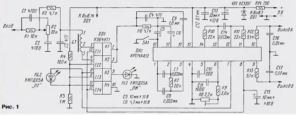 ЭНЦИКЛОПЕДИЯ РАДИОЭЛЕКТРОНИКИ И ЭЛЕКТРОТЕХНИКИ Стереодекодер с входным фильтром КСС. Энциклопедия радиоэлектроники и электротехники Энциклопедия радиоэлектроники и электротехники / Гражданская радиосвязь Как простыми средствами повысить качество принимаемых стереофонических программ звукового радиовещания, интересует многих радиолюбителей. Автор статьи анализирует способ формирования частотных и фазовых характеристик радиотракта и определяет звенья, в которых с небольшими затратами возможно введение корректирующих элементов, позволяющих улучшить выделение сигнала на выходе стереодекодера. Качество стереофонического радиоприема зависит не только от реального соотношения сигнал/шум на антенном входе приемника, но и от работы декодирующего устройства. Как известно, в стереодекодере (СД) комплексный стереосигнал (КСС) преобразуется в полярно-модулированные колебания (ПМК), а затем в выходные низкочастотные сигналы левого и правого каналов. Происходящие при этом преобразования определяют, в частности, столь важный параметр, как переходное затухание между каналами. Наилучшего разделения каналов позволяет достичь временной способ декодирования, при котором исключается восстановление поднесущей и связанные с этим нелинейные и фазовые искажения. На этом принципе работают большинство современных интегральных СД. На качество декодирования также существенное влияние оказывает спектр входного КСС. Верхняя модулированная частота, необходимая для передачи звуковой частоты в 15 кГц, при системе стереовещания с полярной модуляцией (ПМ) и поднесущей 31,25 кГц составляет 46,25 кГц, а при системе с пилот-тоном (ПТ) и поднесущей 38 кГц - 53 кГц. Обязательным условием отсутствия искажений и хорошего разделения каналов является горизонтальная (без завала) АЧХ и линейная ФЧХ в надтональной области частот, вплоть до указанных. В то же время наиболее типичным является радиоприемный тракт, имеющий спад АЧХ на верхних частотах КСС. Этот спад образуется из-за ограниченной полосы пропускания тракта ПЧ и ЧМ детектора. Если частоту среза КСС по уровню - 3 дБ обозначить Fcp, а частоту поднесущей - Fпод, то переходное затухание между каналами можно рассчитать по приближенной формуле р=20 log (2 Fcp/Fпод). Нетрудно подсчитать, что для получения разделения стереоканалов в 30 дБ необходима полоса сигналов с ПМ до 88 кГц, а сигналов с ПТ - до 107 кГц. Разумеется, эти данные являются приблизительными и не учитывают особенностей того или иного способа декодирования. Для коррекции АЧХ КСС в моделях декодеров применяют те или иные корректирующие цепи, как правило, простейшего RC-типа. С другой стороны, чрезмерное расширение спектра КСС приводит к резкому возрастанию шумов и помех от преобразования внеполосных сигналов. Если полоса КСС ничем не ограничена, то ухудшение соотношения сигнал/шум при приеме удаленных станций может составить 20 дБ и более по сравнению с монофоническим режимом. И напротив: сужение полосы КСС является эффективным шумопонижающим приемом. Противоречивым требованиям к КСС в наилучшей степени удовлетворяет АЧХ максимально плоская до частоты 70...80 кГц с дальнейшим резким спадом, организуемым фильтрами высоких порядков. Такая характеристика позволяет приблизиться к предельно достижимым параметрам конкретного СД по шумам и переходному 