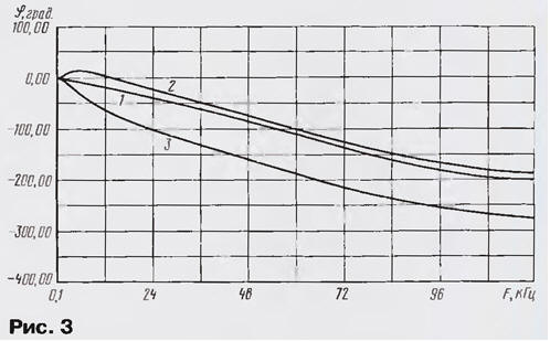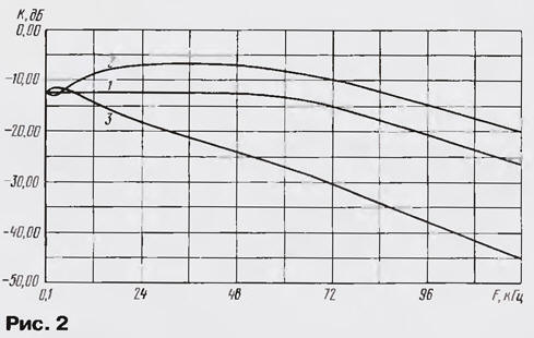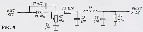Функционально устройство состоит из трех блоков (рис. 1): входного фильтpa KCC, коммутатора на микросхеме DD1 и собственно декодера на микросхеме DA1. Фильтр КСС представляет собой дальнейшую модернизацию устройства [2]. Его параметры улучшены компьютерным моделированием - уменьшена неравномерность АЧХ в тональной области и увеличена крутизна среза в надтональной. Фильтр состоит из регулируемого звена R1,R2,C1,C2 и ФНЧ 3-го порядка C3, L1, С4 с переключаемой в зависимости от системы стереовещания частотой среза. АЧХ фильтра - в режиме приема с ПТ (показаны на рис. 2). Звено R1,R2, C1,C2 - мостовой регулятор верхних частот КСС. В нем с помощью переменного резистора R2 можно увеличивать или уменьшать уровень надтональных (и частично тональных) составляющих, что приводит к пропорциональному расширению или сужению стереобазы за счет изменения переходного затухания между каналами [2]. В среднем положении регулятора R2 АЧХ фильтра горизонтальна вплоть до частоты среза (см. рис.2, кривая 1), в двух крайних положениях - неравномерность ее в звуковом диапазоне не превышает 2 дБ. Регулировка захватывает лишь верхнюю часть звукового спектра - выше 10 кГц, что позволяет при уверенном приеме подчеркнуть высшие частоты и тем самым улучшить качество звучания. Одновременно изменяется и уровень шума, он минимален в нижнем положении движка резистора R2, когда надтональная часть КСС фактически срезается и звучание близко к монофоническому. Таким образом, регулируемое звено фильтра позволяет получать адаптивное качество выходного сигнала в зависимости от входного - от расширенного "Стерео" для мощных сигналов РЧ до "Моно" - для зашумленных и искаженных, в частности, многолучевым приемом. П-образный ФНЧ 3-го порядка собран на элементах C3, L1, С4. Этот фильтр предназначен для эффективного подавления шумов и помех от преобразования сигналов, лежащих за основной информационной полосой КСС. ФНЧ синтезирован приложением Design программы MicroCap6.0. Его параметры: частота среза в системе с ПТ - 75 кГц, в системе с ПМ - 60 кГц, крутизна спада за полосой прозрачности - 15...17 дБ/окт, характеристическое сопротивление - 4,7 кОм. Частота среза конструктивно изменяется переключением числа витков катушки L1 электронным коммутатором DD1. Благодаря компьютерному моделированию фильтр имеет гладкую АЧХ (см. рис.2) и достаточно линейную ФЧХ (рис. 3). Фильтр КСС подключен к стереодекодеру (микросхема DA1) вместо удаленной входной цепи R1C1 [1]. Затухание, вносимое им (12 дБ), компенсируется большим запасом усиления микросхемы DA1 (до 14 дБ). При приеме сигналов с ПМ на выводе 8 микросхемы DA1 устанавливается низкий логический уровень, близкий к нулю. На управляющих входах 5 и 6 коммутатора DD1 имеется высокий логический уровень, подаваемый со средней точки делителя R4, R5. При этом ключ К2 по выводам 4 и 3 замкнут, вывод 3 катушки L1 соединен с конденсатором С4. Фильтр настроен на частоту среза 60 кГц. Одновременно открыт ключ КЗ и через его выводы 8 и 9 напряжение индикации с вывода 7 микросхемы DA1 подается на светодиод HL1, индицирующий режим "ПМ". При распознавании сигналов с ПТ уровень напряжения на выводе 8 микросхемы DA1 изменяется на высокий, фактически равный напряжению питания. Этот сигнал поступает на управляющие входы 12 и 13 ключей К1 и К4 коммутатора DD1. Ключ К4, открываясь, уменьшает напряжение на средней точке делителя R4R5 до низкого у