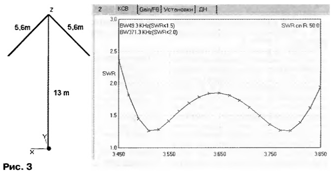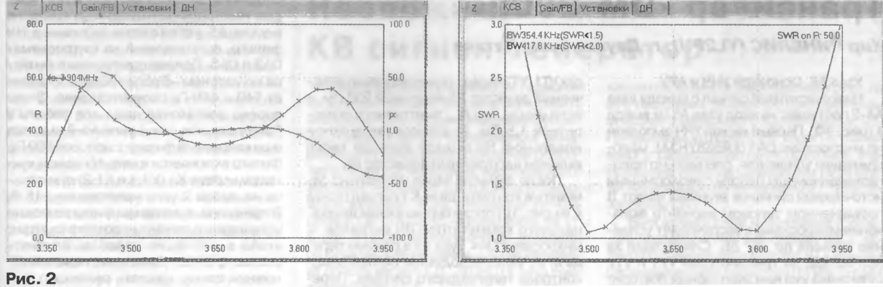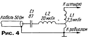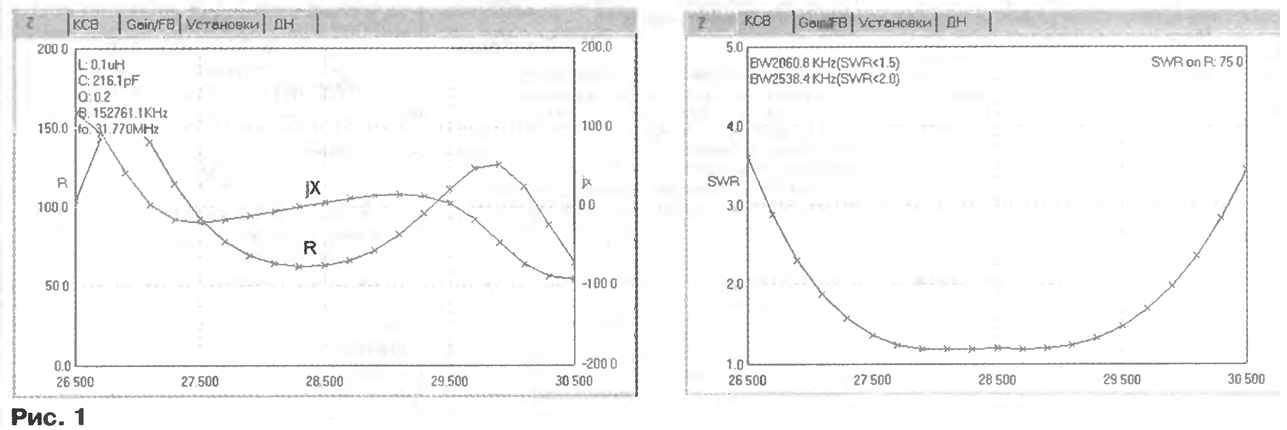 ЭНЦИКЛОПЕДИЯ РАДИОЭЛЕКТРОНИКИ И ЭЛЕКТРОТЕХНИКИ Широкополосное согласование. Энциклопедия радиоэлектроники и электротехники Энциклопедия радиоэлектроники и электротехники / Антенны. Измерения, настройка, согласование Некоторые любительские KB диапазоны (160, 80 и 10 метров) имеют широкую относительную полосу частот - почти 10%, и не всякая антенна удовлетворительно работает на всех частотах этих диапазонов. Заменить узкополосную антенну более широкополосной - далеко не простое и не самое дешевое решение проблемы. Существует и другая возможность существенно расширить рабочую полосу частот узкополосной антенны - с помощью специальным образом спроектированного согласующего устройства. Вопросы создания таких устройств и рассмотрены в публикуемой статье. Нередко антенная система со своим согласующим устройством (СУ) не перекрывает нужную полосу частот при заданном КСВ. При этом антенна имеет свою полосу, а СУ - свою. И, казалось бы, при последовательном включении суммарная полоса частот (BW) будет меньше. Но учтем, что антенна и СУ, как правило, резонансные устройства. Поэтому BW антенной системы может как сузиться, так и расшириться, все зависит от характера изменения реактивности jX(f) у антенны и СУ. Вспомним о технике полосовых фильтров - двухконтурный фильтр может иметь более широкую полосу, чем одиночный контур. Как известно, правильно сделанный полосовой фильтр содержит чередующиеся последовательные и параллельные колебательные контуры. У нас один из контуров - антенна (с некоторым приближением так можно считать). Следовательно, в зависимости от того, каков характер изменения jXa от частоты (как у последовательного или как у параллельного LC-контура), надо выбирать характер изменения jXcу(f). 1. Широкополосное согласование параллельным LC контуром в точке питания Вблизи резонансной частоты эквивалентной схемой полуволнового (λ/2) диполя, питаемого в центре, является обычный последовательный LC-контур. То же относится и к λ/4 GP. Если первый контур (антенна) последовательный, то для образования широкополосного двухконтурного фильтра к нему надо подключить параллельный LC-контур, настроенный на среднюю частоту диапазона согласования. Он присоединяется параллельно питающему кабелю и, соответственно, антенне. К чему это приводит, показано на рис. 1, на примере λ/2 диполя на 28 МГц, параллельно которому подключен параллельный же LC-контур (конденсатор емкостью 500 пФ и катушка индуктивностью 62 нГн). Зависимость jX(f) приобретает характерный для широкополосных систем согласования S-образный характер, и при правильной настройке пресекает нулевое значение трижды. Это и есть следствие взаимной компенсации реактивностей антенны и СУ (нашего контура). В результате BW по уровню КСВ<2 расширяется более чем в полтора раза по сравнению с обычным полуволновым диполем. Зависимость R(f) имеет непривычный вид - на средней частоте (где LC-контур настроен в резонанс и никак не влияет) R соответствует сопротивлению простого диполя. При расстройке в любую сторону от центральной частоты наличие LC-контура приводит к трансформации сопротивлений и повышению суммарного R. В результате зависимость R(f) имеет два максимума, почти симметрично расположенных относительно центральной частоты. Реактивное сопротивление контурного конденсатора на рабочей частоте обычно леж