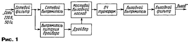 Энциклопедия радиоэлектроники и электротехники / Гражданская радиосвязь Многим радиолюбителям, наверняка, на ум приходила такая мысль: "Как несуразно получается! Трансиверы неуклонно уменьшаются в размерах и в весе, а блоки питания по-прежнему остаются тяжелы и громоздки". Примерно также размышлял и автор этой статьи. Итогом этих размышлений стала разработка блока питания, который на данный момент успел побывать во многих радиоэкспедициях и на слетах, где в достаточно жестких условиях, сутками не выключаясь, питал импортные трансиверы более десяти различных моделей при полной выходной мощности как от стационарной осветительной сети, так и от бензоагрегатов. Немного наблюдений Интересные выводы можно сделать, творчески осмысливая параметры импортных трансиверов, приводимые в их "Руководстве пользователя" и в "Руководстве обслуживания" и мимо которых зачастую проходит взгляд даже искушенного радиолюбителя. Судите сами. Нужна ли стабилизация напряжения для трансивера, напряжение питания которого по паспортным данным может колебаться в пределах ±15 % от номинального значения в 13,8 В, в соответствии с ГОСТ сетевое напряжение может изменяться в пределах ±10 %? Сторонникам жесткой, до милливольт, стабилизации в блоках питания можно порекомендовать замерить колебания напряжения питания непосредственно на разъеме трансивера, то есть с учетом падения напряжения на проводах, а также попробовать запитать трансивер от автомобильного аккумулятора. В первом случае можно увидеть просадку напряжения около 0,5 В, а во втором случае, с аккумулятором, и того больше, причем напряжение может колебаться как в минус, так и в плюс. Стоит ли после таких аргументов стремиться так уж тщательно стабилизировать напряжение в блоке питания? Заглянув в принципиальную схему трансивера, можно еще больше утвердиться в мнении, что не стоит тратить лишние силы на стабилизацию. В самом трансивере есть собственная эффективная внутренняя система питания отдельных узлов. Вообще, ее можно разделить на три ветви: стабилизатор напряжения +5 В для питания всех цифровых микросхем, стабилизатор напряжения +9 В для питания предварительных каскадов приемопередающего тракта и, наконец, система питания выходного каскада передатчика. Только на усилитель мощности трансивера поступает полное напряжение с разъема питания, да и то оно проходит через внутренние фильтры и предохранители. От превышения его защищает мощный стабилитрон, рассчитанный на напряжение несколько выше предельно допустимого, включенный параллельно питающей цепи после предохранителей. Постоянство выходной мощности поддерживается системой ALC. В импульсных блоках питания пульсации с частотой преобразования легко отфильтровываются с помощью небольших по емкости и, соответственно, по габаритам конденсаторов, включенных после выходного выпрямителя. Техническое задание Все вышеприведенные соображения и легли в основу идеи той конструкции, которая ныне питает трансивер автора. Идея непривычная, нетрадиционная, и заключалась она в том, чтобы создать преобразователь переменного напряжения сети в постоянное напряжение, близкое к номинальному (13,8 В), с необходимой нагрузочной способностью, но без потерь на стабилизацию. Очевидно, что это устройство должно было использовать принцип высокочастот