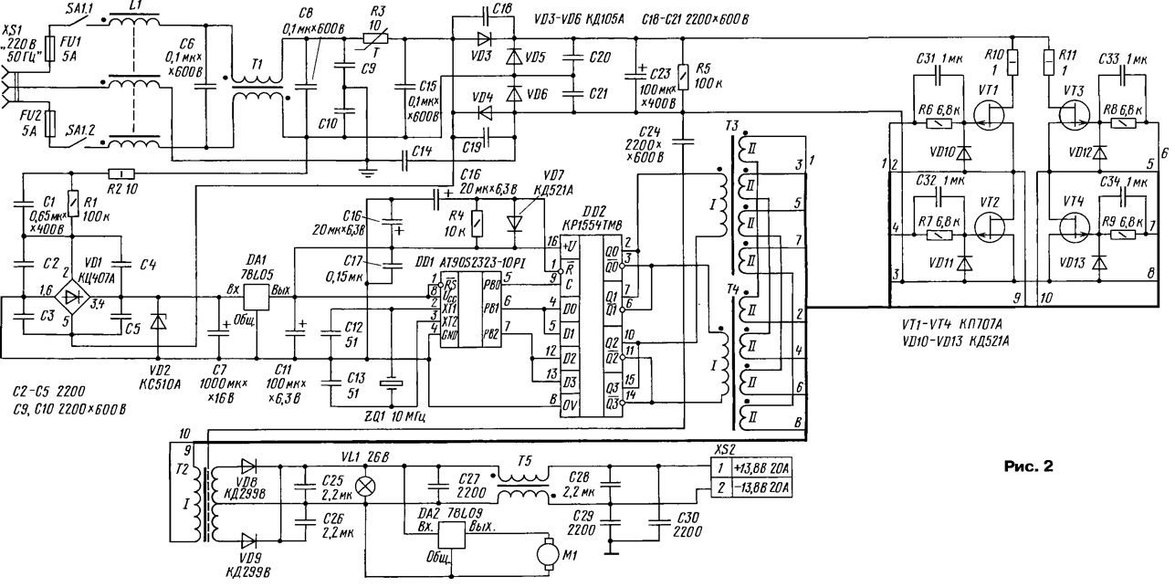 Как и в других импульсных источниках, таких, например, как в любом современном телевизоре или компьютере, сетевое напряжение подается через фильтр, затем выпрямляется диодным мостом. Пульсации отфильтровываются электролитическим конденсатором. Величина выпрямленного напряжения на этом конденсаторе будет примерно 310 В. Это напряжение коммутируется мостовой "Н"-образной схемой на четырех полевых транзисторах. У специалистов этот узел называется "инвертер". С диагонали моста напряжение прямоугольной формы подается на понижающий трансформатор, выпрямляется, фильтруется и поступает на выход устройства. Применение новых транзисторов позволило значительно увеличить крутизну фронтов на выходе инвертера, что, в свою очередь, позволило уменьшить время протекания сквозного тока через плечи моста в момент его переключения. Это обстоятельство, в свою очередь, позволило получить большой выигрыш в КПД каскада и поднять частоту преобразования. Эффективность ключевого каскада повысилась настолько, что оказалось возможным совсем отказаться от радиаторов для транзисторов. Причем, при максимальной мощности преобразователя, равной приблизительно 250 Вт, корпус блока питания за долгое время работы остается чуть теплым. Полевые транзисторы с изолированным затвором, в отличие от биполярных, не имеют эффекта накопления неосновных носителей в области базы - насыщения, что не затягивает их скорость переключения. В добавок, они способны регулировать свой ток стока при увеличении температуры корпуса. Еще одно удивительное их свойство - они имеют бесконечно большой коэффициент усиления по мощности в статическом режиме, т. е. не потребляя мощности по цепи затвора способны коммутировать значительные мощности в цепи канала (участок сток-исток). Поэтому в динамическом режиме энергия затрачивается в основном на компенсацию заряда, накопленного на межэлектродной емкости затвор-исток во время предыдущего полупериода управляющего напряжения. Величина данной емкости составляет примерно 1000 пФ и определяет требования, предъявляемые к драйверу - он должен обеспечивать хорошую крутизну фронтов и постоянство амплитуды импульсов, подаваемых на затворы ключей, при работе на емкостную нагрузку. Современная элементная база помогла и тут. Цифровые микросхемы серии КР1554 (74НС) отлично справляются с поставленной задачей. Принципиальная схема импульсного блока питания представлена на рис. 2. Сетевое напряжение 220 В поступает на мостовую сборку VD1 узла питания драйвера через балластный конденсатор С1 и резистор R2, демпфирующий пусковой импульс тока. Все диоды этой сборки для нейтрализации их динамической емкости зашунтированы небольшими по емкости конденсаторами С2 - С4. Резистор R1 разряжает конденсатор С1 после выключения устройства. Драйвер состоит из кварцованного генератора с частотой 50 кГц и из мощного каскада. Напряжения на затворы в нужных фазах подаются через трансформаторную схему сложения мощностей на двух ферритовых кольцах. Питание на драйвер поступает от отдельного узла питания, использующего балластный конденсатор в сетевой цепи. Выпрямленное пульсирующее напряжение с моста подводится непосредственно к стабилитрону VD2. Обычно в подобных схемах в цепи стабилитрона, последовательно с ним, ставится ограничительный резистор, но в данн
