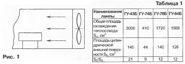 При зазоре В = 0 боковая поверхность теплоотвода не участвует в теплоотдаче и температура анода максимальна. При В = 7 мм tAmax уменьшилась на 15 °С, так как в охлаждении начала участвовать боковая поверхность теплоотвода. С увеличением зазора В до 17 мм tAmax уменьшилась еще на 5 °С. При увеличении зазора возрастает скорость воздуха на внешней стороне теплоотвода, поэтому улучшение охлаждения возможно, но разница с предыдущим опытом не превышает ошибки измерения. Следовательно, для эффективного охлаждения наружной поверхности теплоотвода лампы достаточно зазора 5... 10 мм. С учетом вышеизложенных результатов была изготовлена и испытана вытяжная система охлаждения для лампы ГУ-84Б (рис. 6).