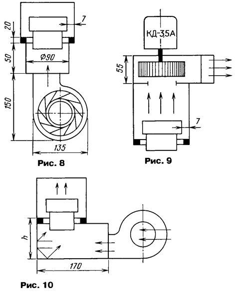 При повседневной работе время передачи не превышает, как правило, 1...2 мин и лампа просто не успевает разогреться, а во время приема она быстро охлаждается. Поэтому интенсивность обдува в CW и SSB режимах может быть в несколько раз ниже, чем при непрерывном излучении. Системы охлаждения с центробежным вентилятором Испытаны три системы обдува с центробежным вентилятором: приточная с соосным потоком (рис. 8), вытяжная (рис. 9); приточная с боковым потоком (рис. 10).