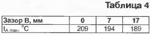 С уменьшением расстояния А до 50 мм теплоотвод лампы входит в зону завихрений перед вентилятором и tAmax возрастает на 10 % из-за ухудшения охлаждения. При значительном удалении вентилятора охлаждение также ухудшается из-за возрастания потерь кинетической энергии воздуха на трение о стенки длинного воздуховода. Наилучшие условия охлаждения обеспечиваются при А, равном 1,0...1,2 диаметра вентилятора. Температура воздуха перед вентилятором по мере удаления от анода уменьшается с 97 до 49 °С за счет охлаждения через стенки воздуховода. Для лучшей теплоотдачи они должны иметь минимальную толщину. Температура лопастей меньше, чем у входящего в вентилятор потока воздуха. Это объясняется тем, что горячий воздух, выходящий из вентилятора, интенсивно перемешивается с наружным, быстро охлаждается сам и охлаждает внешние стороны лопастей вентилятора. По этой же причине с уменьшением А температура лопастей растет медленнее, чем температура горячего воздуха перед вентилятором. Результаты измерений, приведенные в табл. 4, показывают зависимость tAmax от величины зазора В при РА = 770 Вт и А = 115 мм.