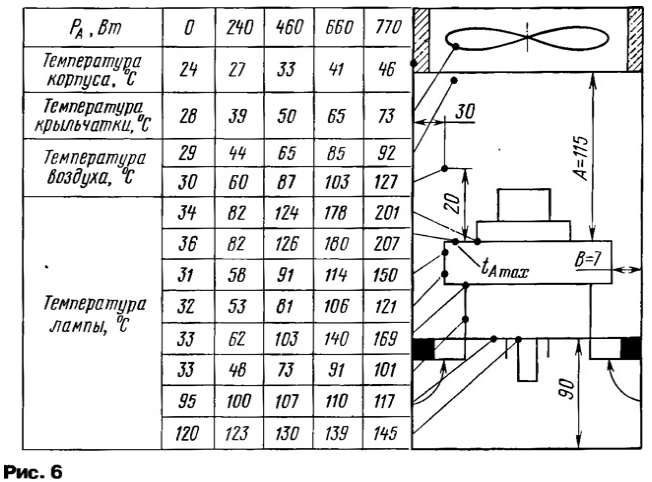 Неэффективность обдува приточной системы с боковым потоком (рис. 10) видна без испытаний, так как воздух, ударяясь в стенку, теряет большую часть кинетической энергии и только потом, рикошетом, направляется к лампе. Измерения проведены, чтобы сравнить количественные показатели этой и других систем. Результаты испытаний (табл. 6) показали, что наименьшие потери достигаются при минимальных размерах входного отсека, т.е. когда он фактически является продолжением воздуховода с боковым выходным отверстием. В этом случае подача, по сравнению с соосным потоком (рис. 8, табл. 6), меньше в 2,8 раза, a tA max выше на 70° С или в 1,7 раза.