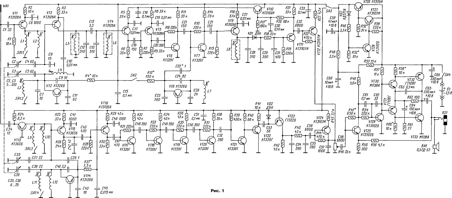 При испытаниях приемник работал ежедневно по 9 ч вместо абонентского громкоговорителя. При использовании щелочного элемента типа LR6 "ALKALINE" время работы возрастает в несколько раз. Срок службы таких элементов достигает 5 лет, что делает их удобными при долговременном использовании. Для повышения экономичности приемник пришлось оптимизировать, сделав как можно более экономичным каждый его узел. Было ясно, что основная мощность источника питаний будет расходоваться усилителем звуковой частоты, именно этому узлу было уделено повышенное внимание. Испытания корпуса от приемника "СОКОЛ-404" со встроенным громкоговорителем 0.5ГД-37 показали, что для комфортного индивидуального прослушивания иногда вполне достаточно выходной мощности 1 ...3 мВт, а для воспроизведения такого сигнала с приемлемым качеством максимальная мощность усилителя может не превышать 30 мВт. Для "тихих" небольших помещений это значение можно уменьшить в 2-3 раза. Разумеется, важно иметь громкоговоритель с высоким КПД. Испытания показывают, что динамические головки с диаметром диффузора менее 5 см в основном очень малоэффективны, что делает их непригодными для экономичного радиоприемника. При разработке схемы были определены некоторые особенности работы транзисторов, работающих в режимах микротоков. Из формул, приведенных в [2], транзистор при lK = 10 мкА обладает большим собственным сопротивлением эмиттера, равным примерно 2,5 кОм. При таком токе даже при |h21Э| =40 входное сопротивление каскада, собранного по схеме с общим эмиттером, достигает 100 кОм, что позволяет с успехом применять полное включение колебательного контура в цепь базы транзистора. С другой стороны, крутизна характеристики транзистора на таком токе не превышает 0,4 мА/В, поэтому для получения хорошего усиления сопротивление нагрузки каскада должно составлять несколько десятков килоом. Если нагрузкой является колебательный контур, то для получения большего резонансного сопротивления следует выбирать значение индуктивности побольше, а значение емкости - поменьше. Особенно это важно для каскадов УВЧ. Следует также иметь в виду, что частотные свойства транзисторов при токе 10 мкА ухудшаются в несколько раз из-за влияния внутренних емкостей транзистора. Следовательно, для экономичных каскадов следует подобрать транзисторы с малой емкостью коллектора и высокой граничной частотой. Предлагаемый вниманию читателей радиоприемник состоит из двух независимых трактов AM и ЧМ, что позволило до предела упростить коммутацию диапазонов. Может показаться, что схема приемника (рис. 1) слишком сложна и содержит много транзисторов, но транзисторы в пластмассовых корпусах стоят сейчас дешевле конденсаторов. В зависимости от потребностей радиолюбитель может выбрать для себя только один из трактов или уменьшить число диапазонов. Оба тракта имеют стабилизированное питание 0,93 В и работают на общий УЗЧ. Тракт AM выполнен на транзисторах VT1- VT12. УРЧ собран по схеме с общим эмиттером на транзисторе VT1. Гетеродин выполнен по схеме емкостной трехточки на транзисторе VT2. При замыкании контактов переключателя SA1 катушки УРЧ L1, L2 и гетеродина l_3, L4 включаются в каждой паре параллельно, что соответствует работе в поддиапазоне КВ-2. Транзистор VT3 выполняет функции смесителя. Схема его включения нетрадиционная, однако уже была исп