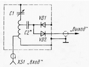 Схема детекторного УКВ ЧМ приемника показана на рис. 3. Его основой является спиральный объемный резонатор. К спирали через разъем XS1 подключается внешняя антенна. По частоте приемник перестраивается конденсатором переменной емкости С1. На диодах VD1, VD2 собран полумостовой выпрямитель (детектор), на который через конденсатор С2 поступает сигнал от резонатора. К выходу детектора экранированным проводом (его емкость сглаживает ВЧ пульсации продетектированного сигнала) подключают нагрузку - высокоомные телефоны или УЗЧ с большим входным сопротивлением. Чем выше сопротивление нагрузки, тем больше будет добротность резонатора, а значит, больший сигнал поступит на диоды и увеличится уровень сигнала ЗЧ.